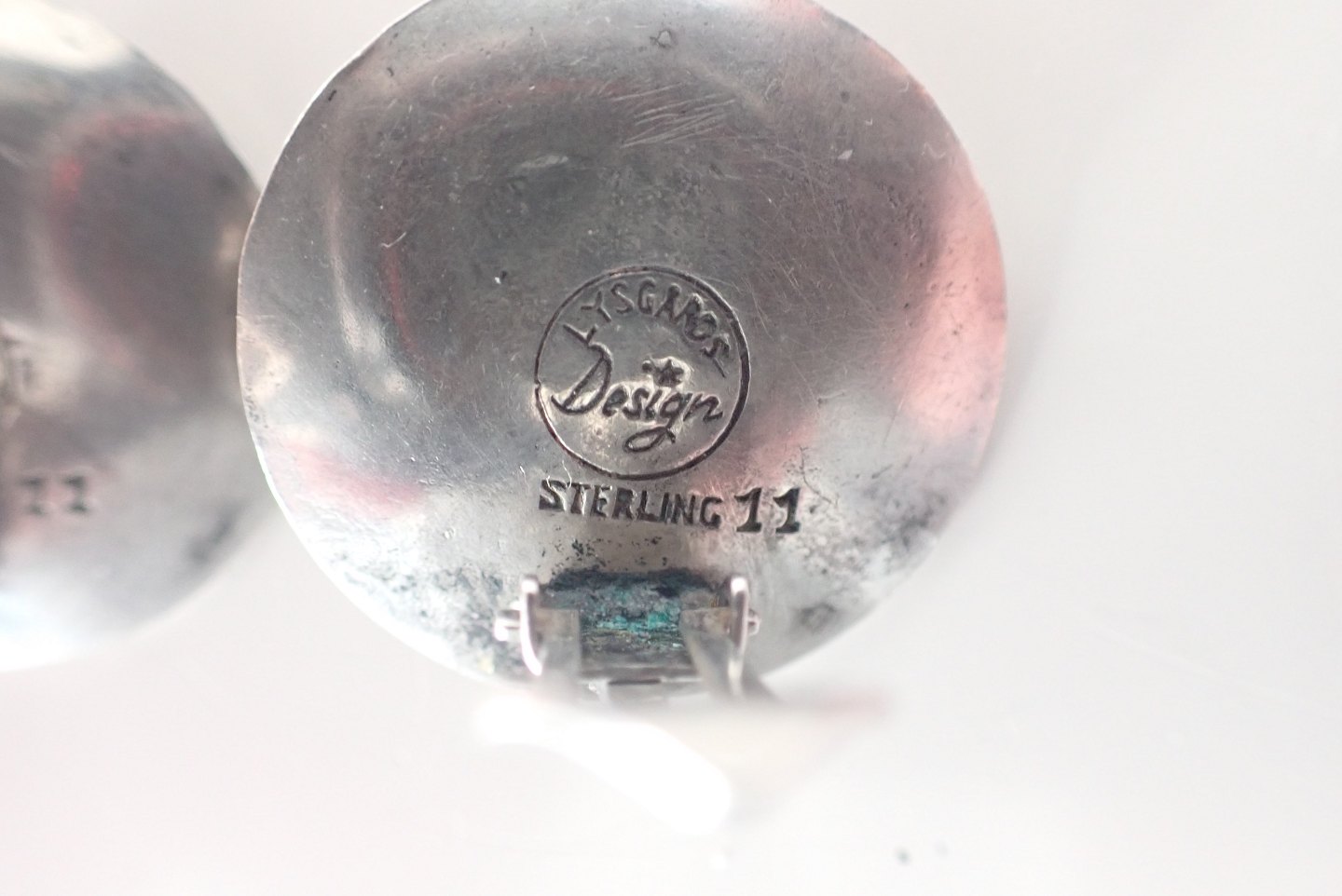 Lysgård Design - Et par planet/måleformede øreklip i patineret sterling sølv med cabochonslebne tigerøje sten. Stemplet Lysgård design, sterling. #11.Ca. 1970. Samlet vægt: 12,4 gram. I fin stand.