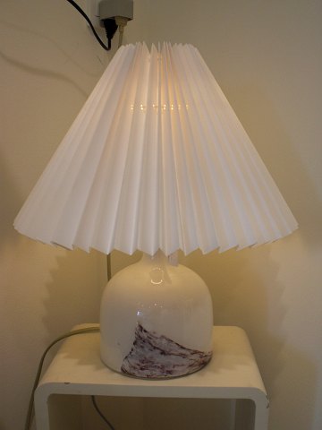 Holmegaard lampe designet af Michael Bang i 1973 - kaldet symetrisk bordlampe. Oplineglase med bordoux of sort indlægsglas i asymetrisk mønster. Højde med skærm 50 cm. Pris inkl. silkeskærm.