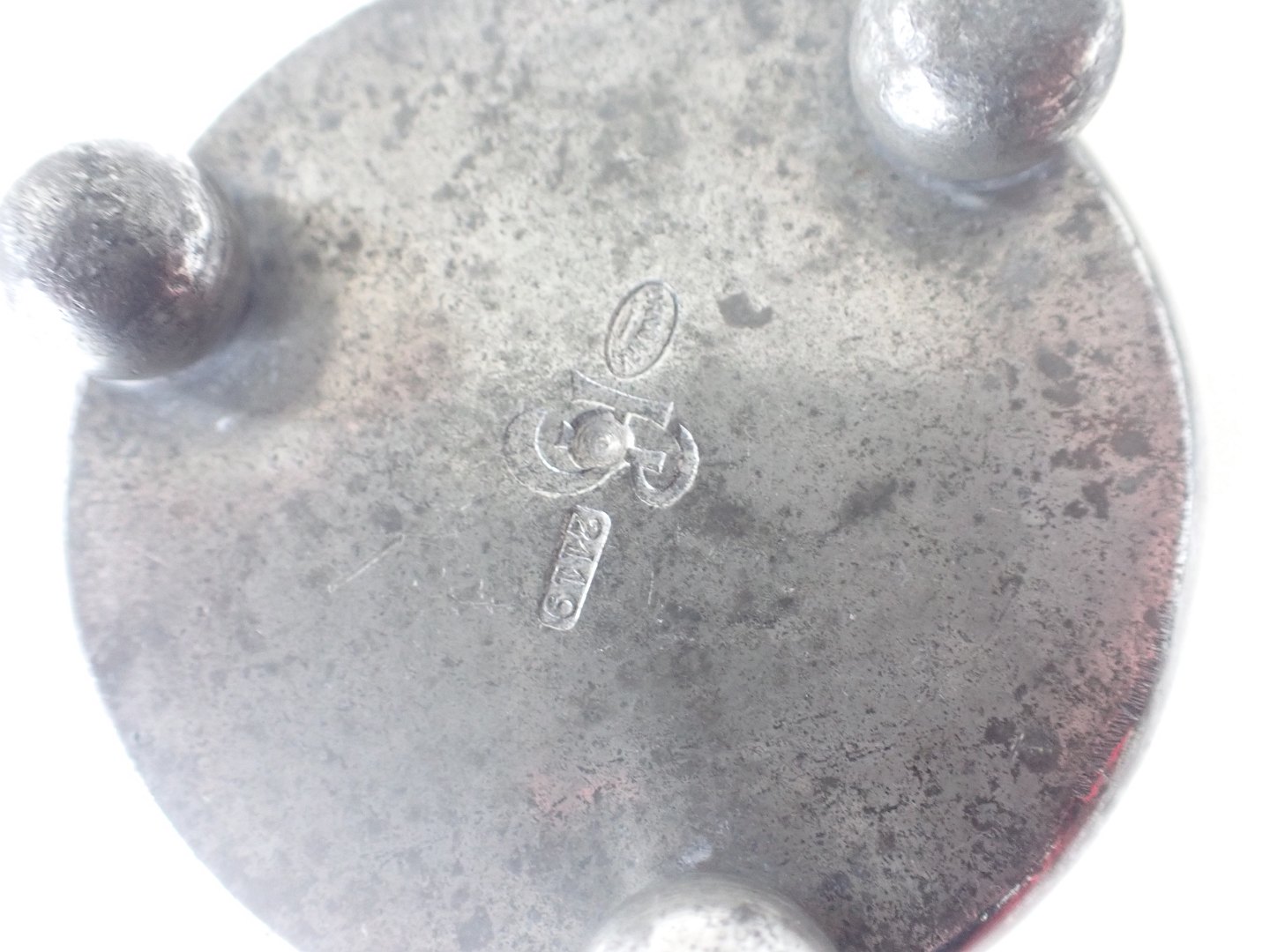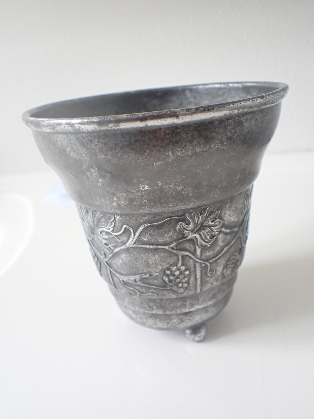 Urtepotteskjuler i tin - sjælden, men noget medtaget indvendig og lidt mørk udvendig; men med smukt bånd i form af en vinranke dekoration dekoration. Ikke i Vejen bogen. Stemplet HPH, Danmark i oval og 2119=1919. Højde: 12,5 cm. diameter foroven: 12,5 cm. .