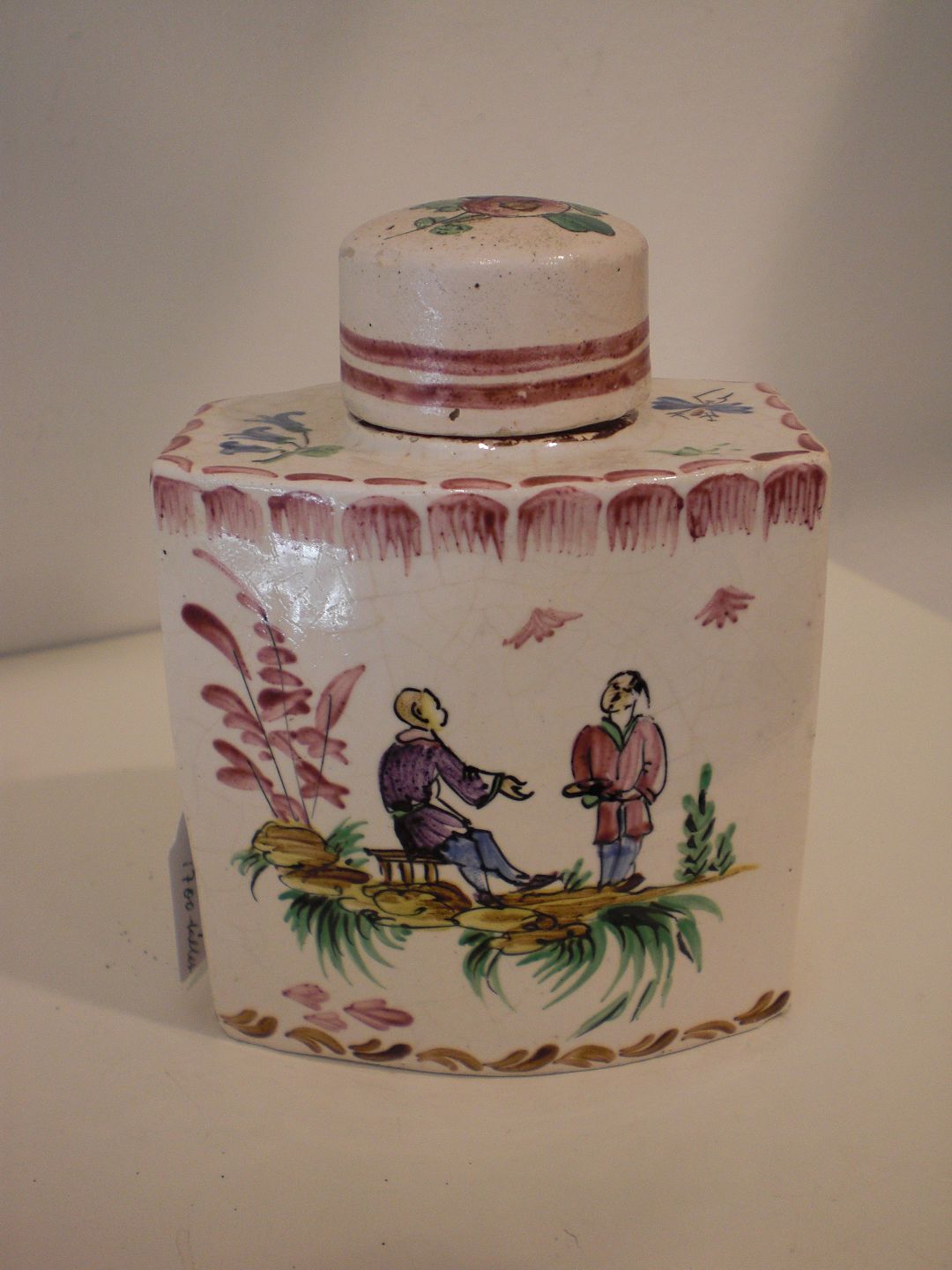 Tedåse i fajance - måske med uoriginalt låg - Frankrig? 1700 -tallet. Højde med låg: 12 cm - bredde: 9 cm. -dybde: 6,5 cm. Stemplet HC.