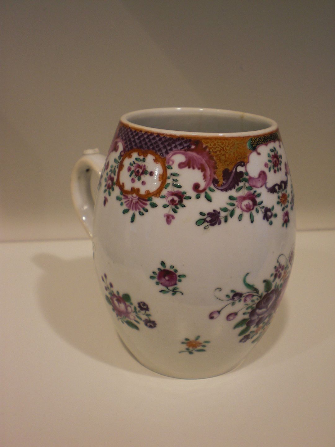 Stort hankekrus, kinesisk fra Chìen Lung perioden ((1736 - 1796). Dekoreret i overglasur med familie Rose dekoration. - Rosa, guld, rødt og grønt. Højde: 12,5 cm. Bredeste diameter: 10 cm. Har en meget svag hairline.