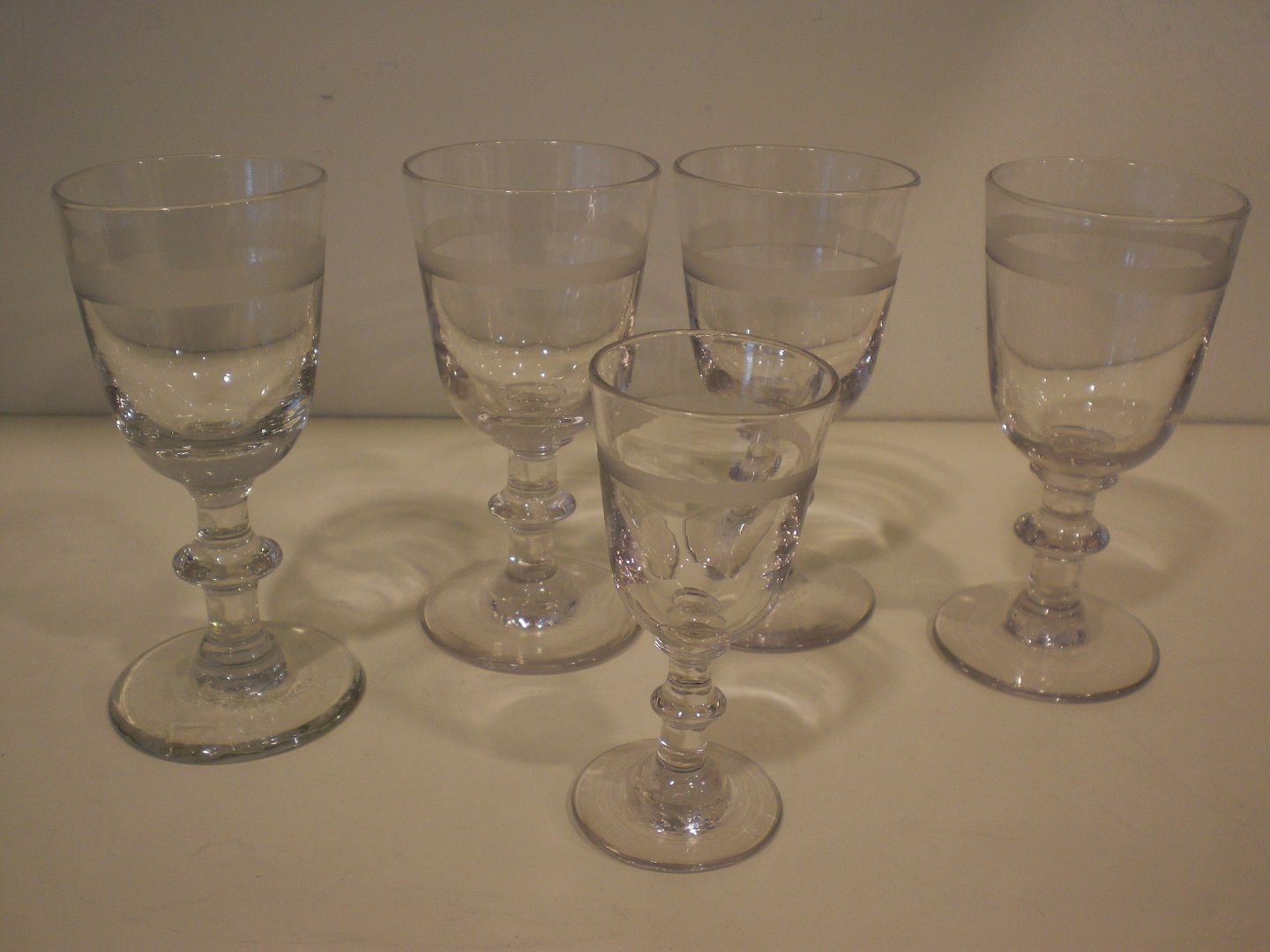 4 berlinoir portvinsglas og 1 snapseglas fra Kastrup 1886 -1930. Med båndslibning på knapstilk. Højde: 10 - 10,3 cm. Pris portvinsglas pr. stk. 300 kr. Snapseglasset er 8,4 cm. Pris: 150 kr.