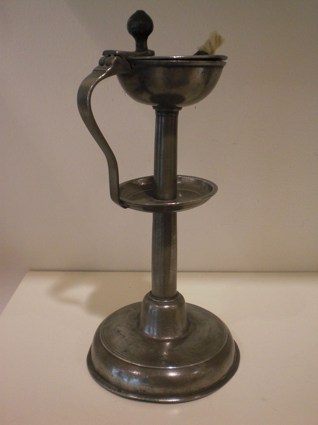 Gammel dansk olielampe i tin. Stammer fra Nislevgård nord for Otterup (nu efterskole). Ca. 1820. Højde: med gæk: 25,5 cm. Diameter fod: 12 cm. Holder til væge er løs.