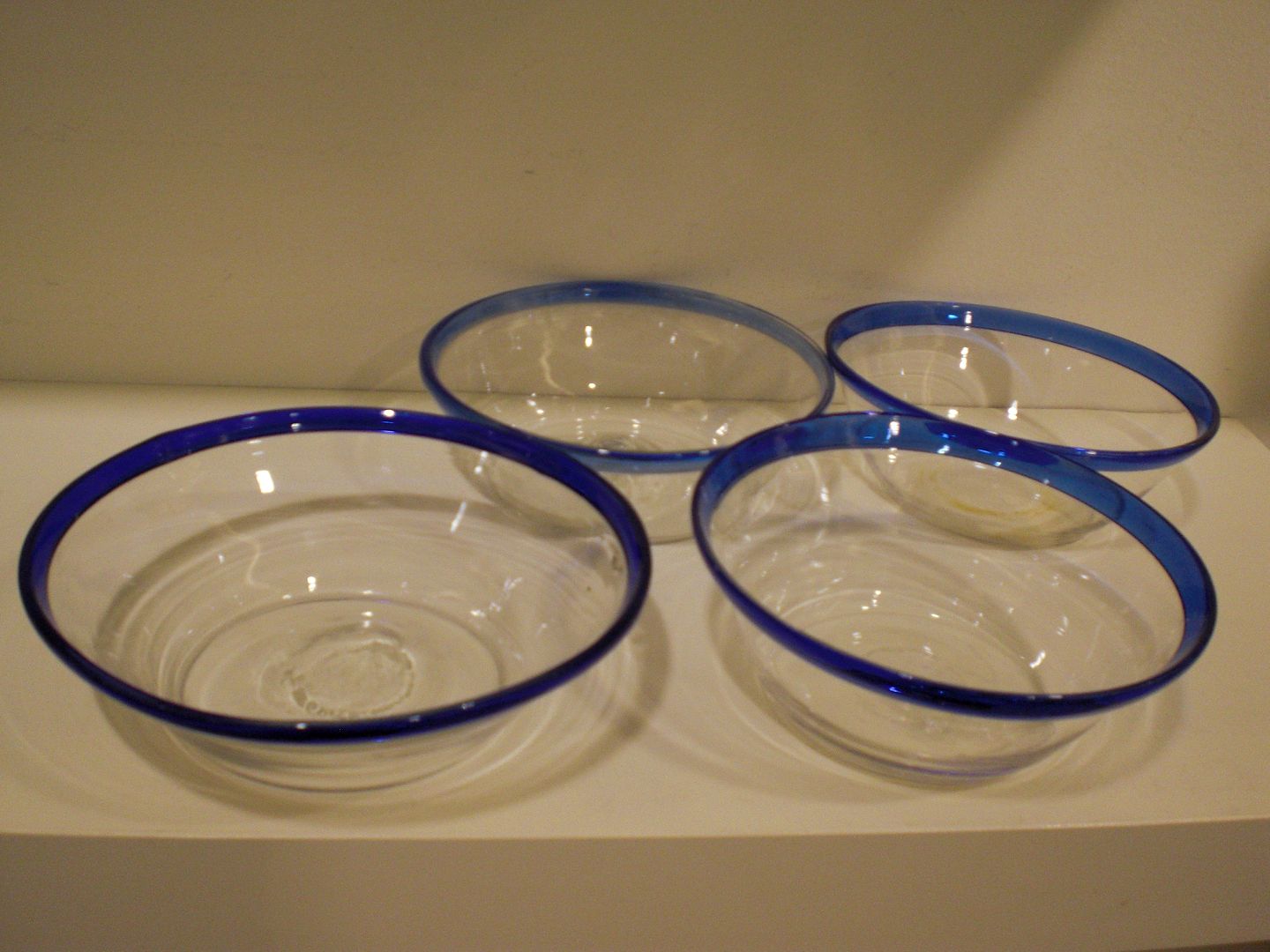 4 danske mælkeskåle I klart glas med blå ombukket kant. Et stk. er solgt.