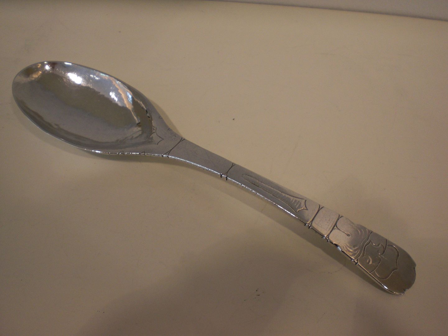 Frederik Kaster Hansen (1871 - 1918) håndsmedet serveringsske i 830 sølv med smuk skønvirkedekoration på både for og bagside. Fra 1918. Med original indskription på bagside af skaft lavet af Kastor Hansen: " MOR EMMA". Vægt: 57 gram. Længde: 21 cm. - breddelaf: 5 cm.