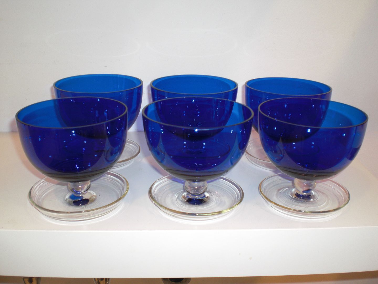 6 dessertskåle i blåt glas på fod af klart glas med knop. Formentlig svenske fra Reijmyre Glasbruk ca. 1960. Alle i fin stand. Højde: 9,5 cm. - diameter foroven: 10 cm. Sælges kun samlet.