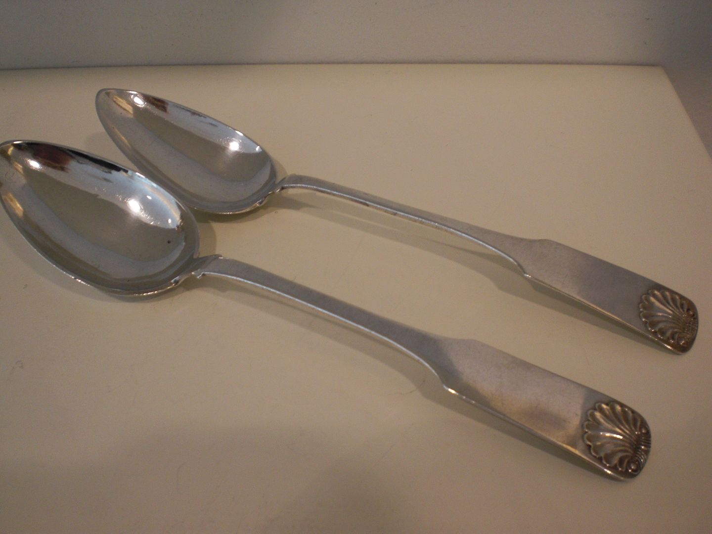 Et par tidlige, store tretårnede sølvskeer I muslingemønstret. Sælges kun samlet