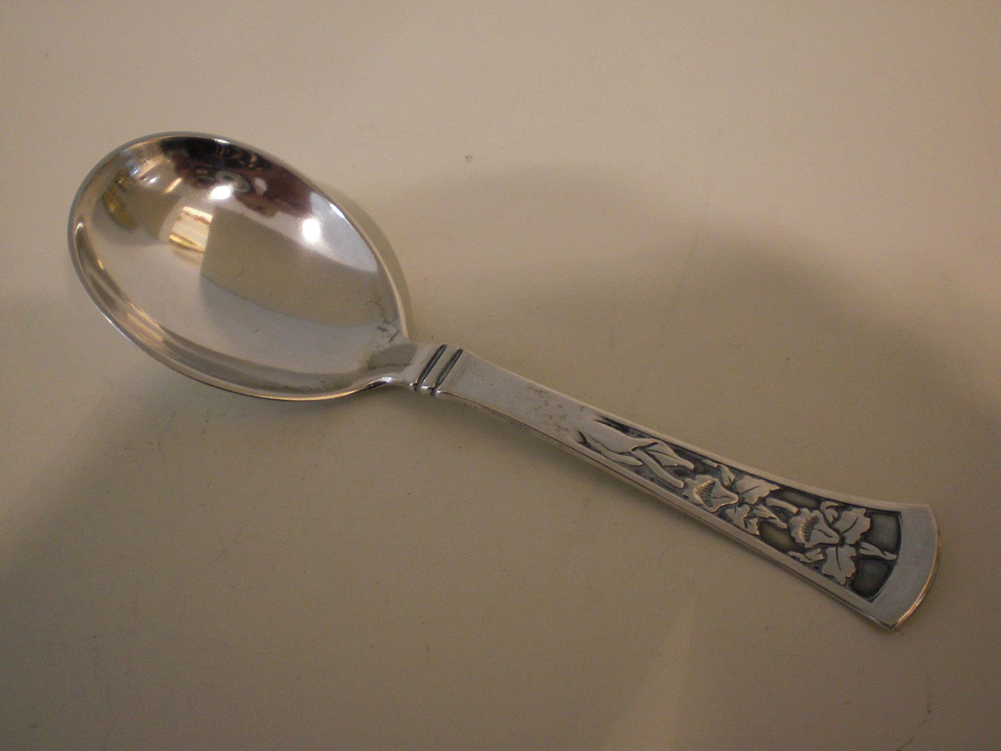 Lille sukkerske med stiliseret blomsterdekoration i tretårnet sølv fra 1951 udført på Danske Guldsmedes Sølvvarefabrik (1945 -1977). Vægt: 12,6 gram. Længde: 10,6 cm