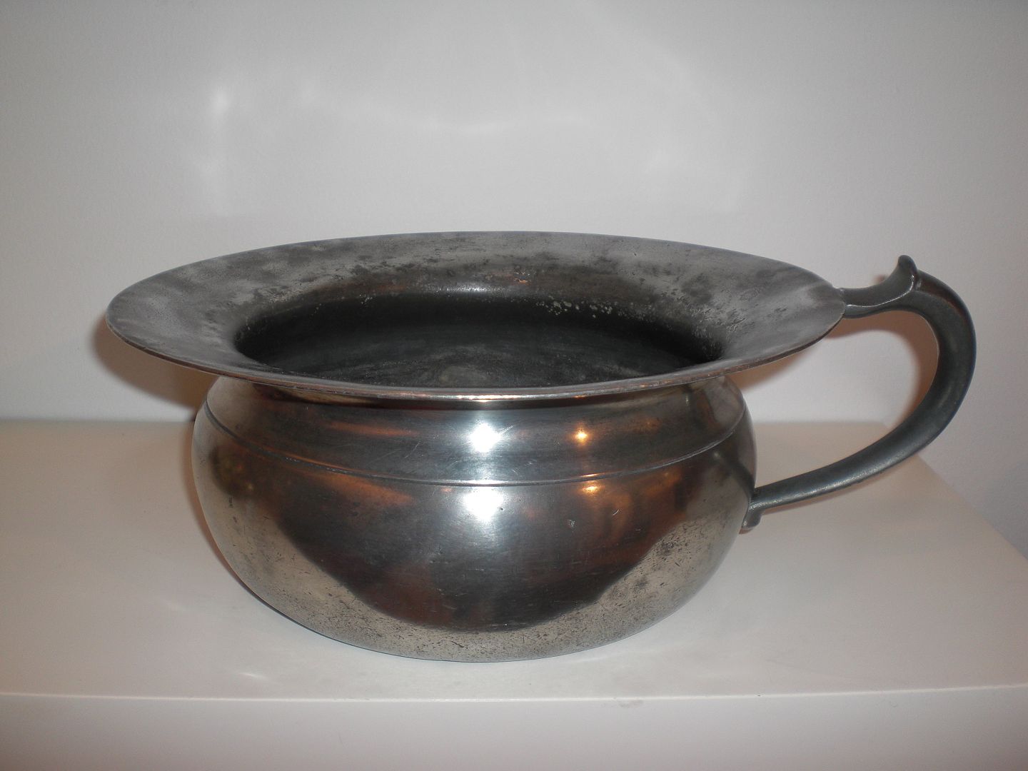 Potte i tin med hank tysk stemplet - 1800-tallet. Højde: 10,5 cm. Diameter uden hank: 26 cm. Har været brugt til blomster, så noget belægning indvendig.