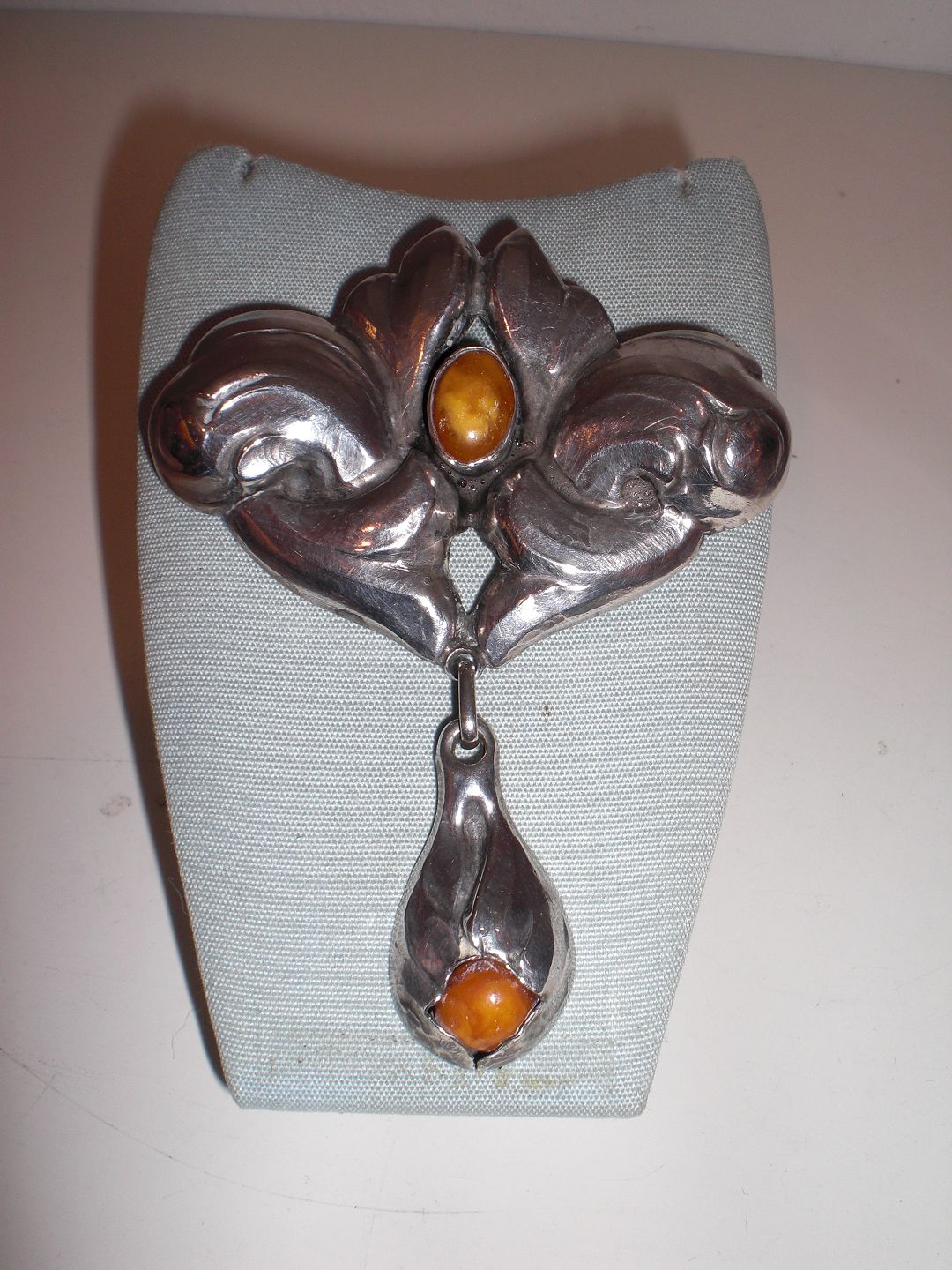 Dobbelt skønvirkebroche i 830 sølv med to cabochonslebne ravstykker (mælkerav) udført af E.L.Weiman,Kbh. (1897 - 1937) ca. 1920. Højde: 7,8 cm. - bredde: 6,3 cm.