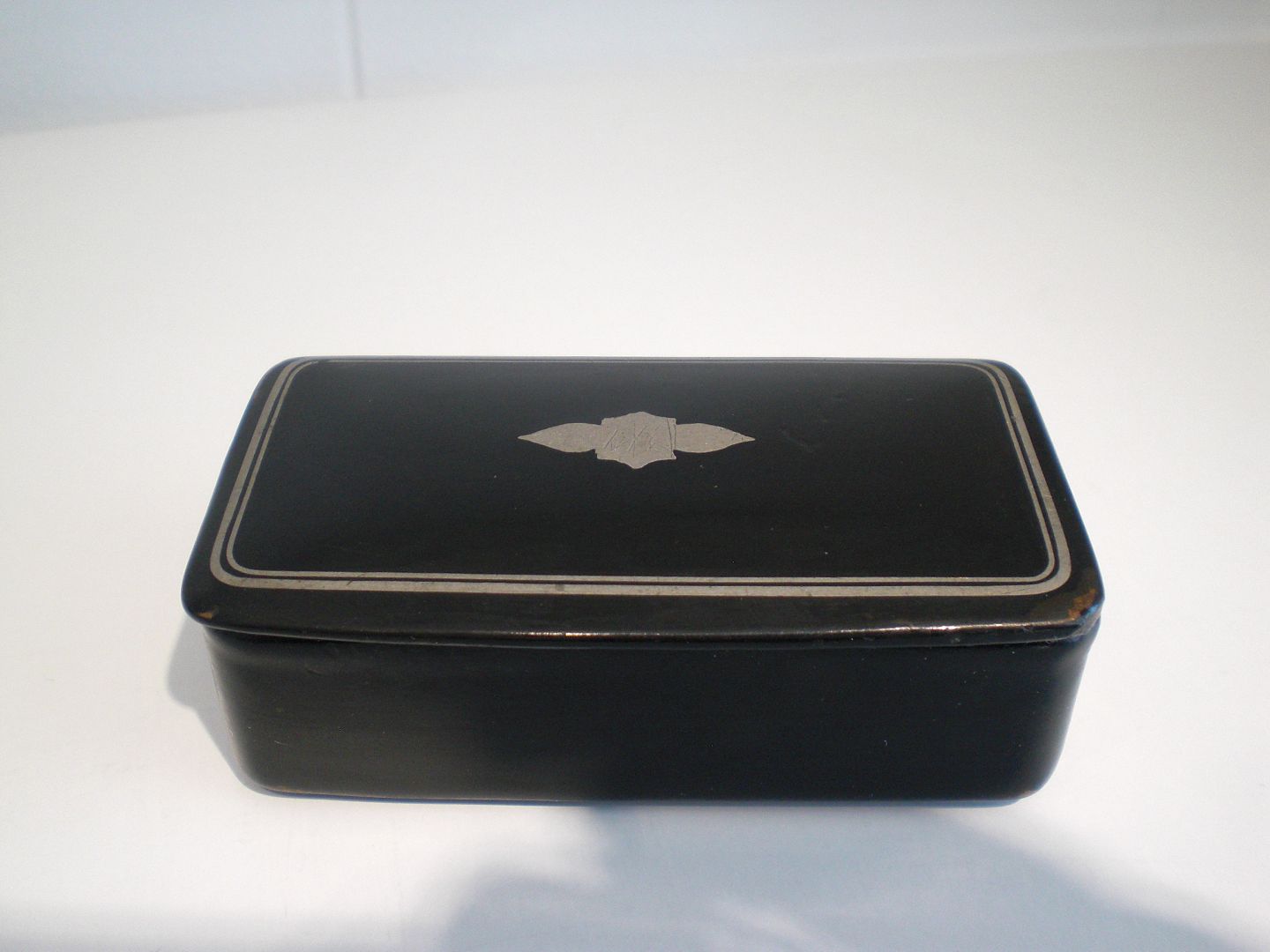 Engelsk snusæske i sortlakeret papmaché med med indlagt dekoration af tin på låget. 1800-tallet. Mål: 8,7 x 4,7 x 3 cm.