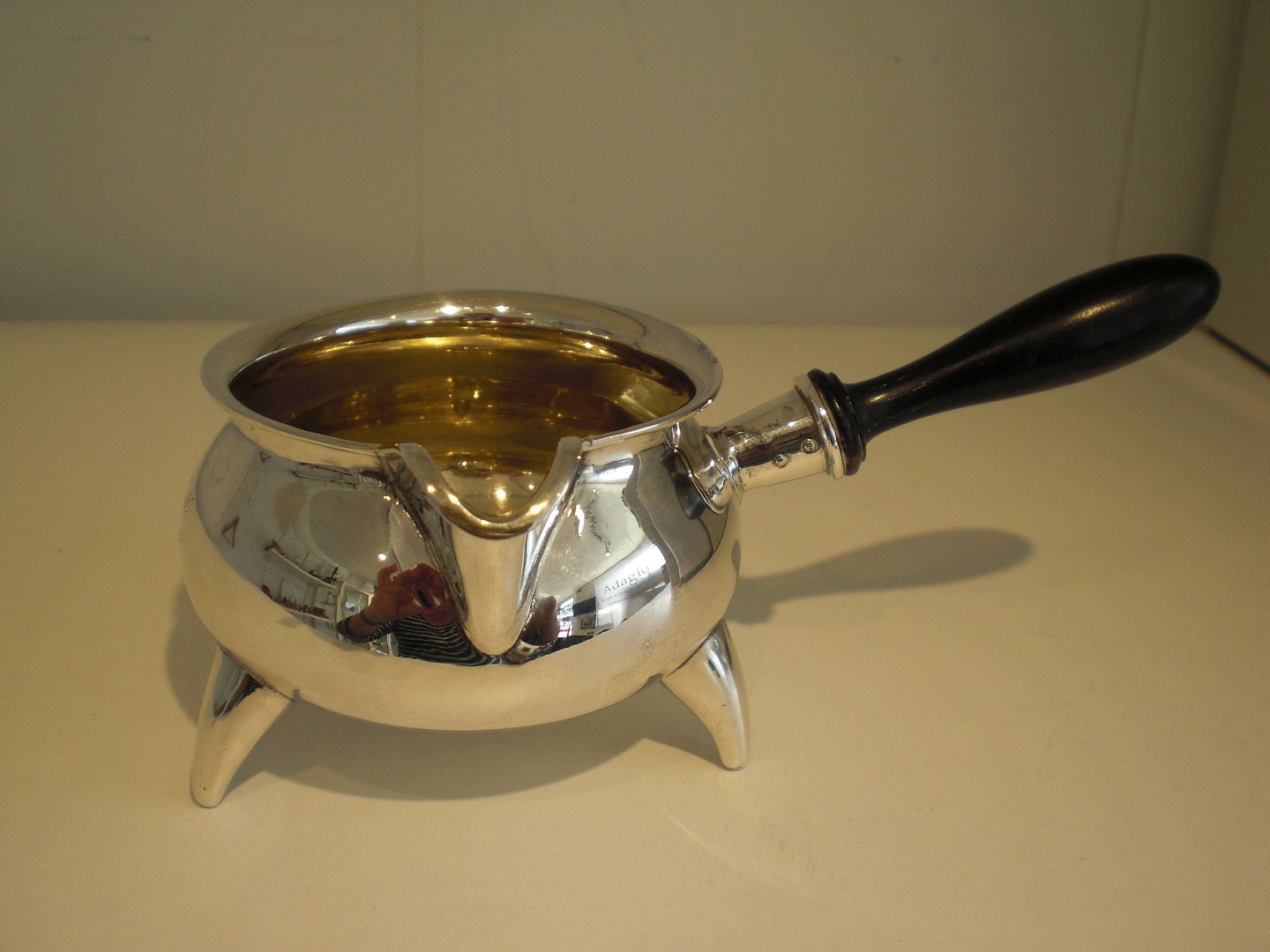 Tretårnet smørnæb med palisander håndtag og forgyldt inderside fra 1917. I fin stand med indgraverede initialer fra 1917. Højde ved tud: 6 cm. Diameter foroven: 7 cm. Samlet mål med stjert: 14,5 cm. Uden mesterstempel - Guardein Heise.