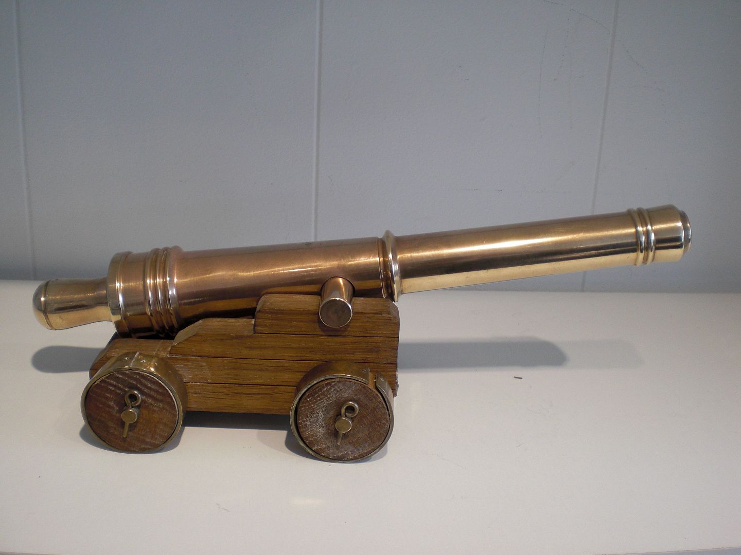 Bord/dekorationskanon messingrør på firhjulet egetræsvogn med messingbeslag. 20 årh. Længde kanonrør: 33,5 cm. Samlet længde på trævogn: 33,5 cm. Samletnhøjde på trævogn: 11,5 cm.