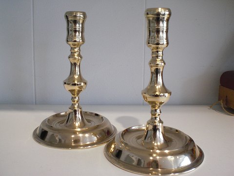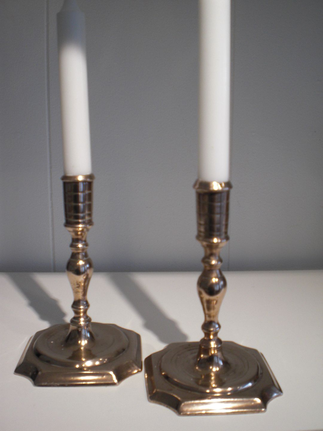 Et par baroksstager i kobber - 1800-tallets begyndelse - på firkantet fod. Højde: 14,3 cm. Fod: 9,3 cm. Brugs- og aldersspor.