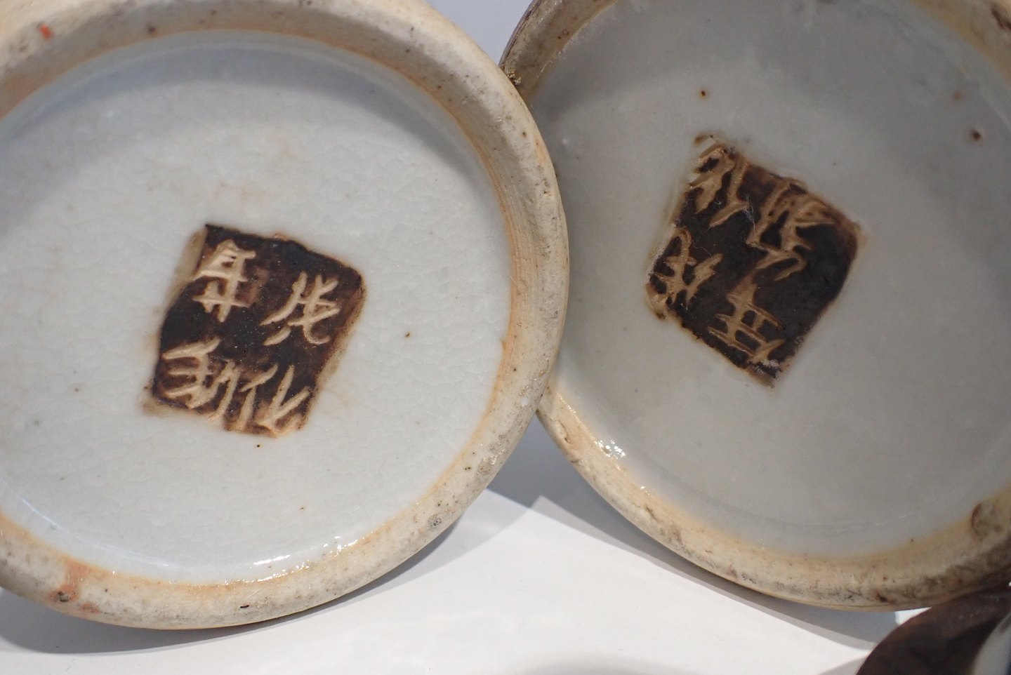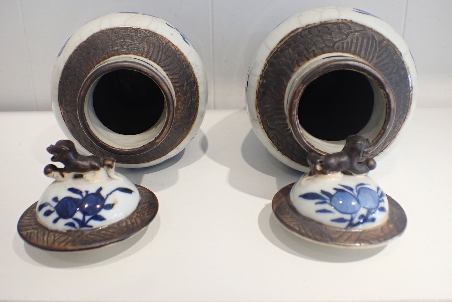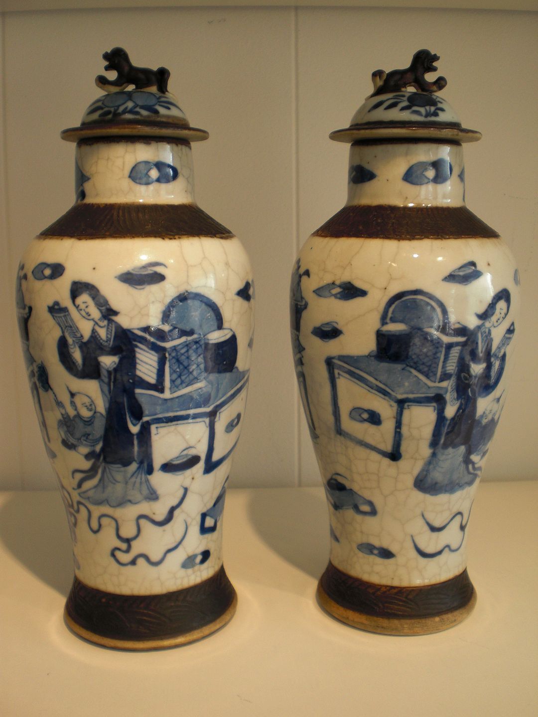 Et par kinesiske lågvaser i let hvid krakeleglasur med blå underglasurdekoration og bronzefarvede skraverede kanter og løvefigur på låg - dekoration: læsende kvinde ved skrivebord med tjener og andre klassiske dekorationselementer . Formentlig Chien Lung perioden (1736 -1795). Højde med låg: 27,5 cm. - bredeste diameter: 12 cm. I fin stand med et meget lille skår på undersiden af det ene låg. .