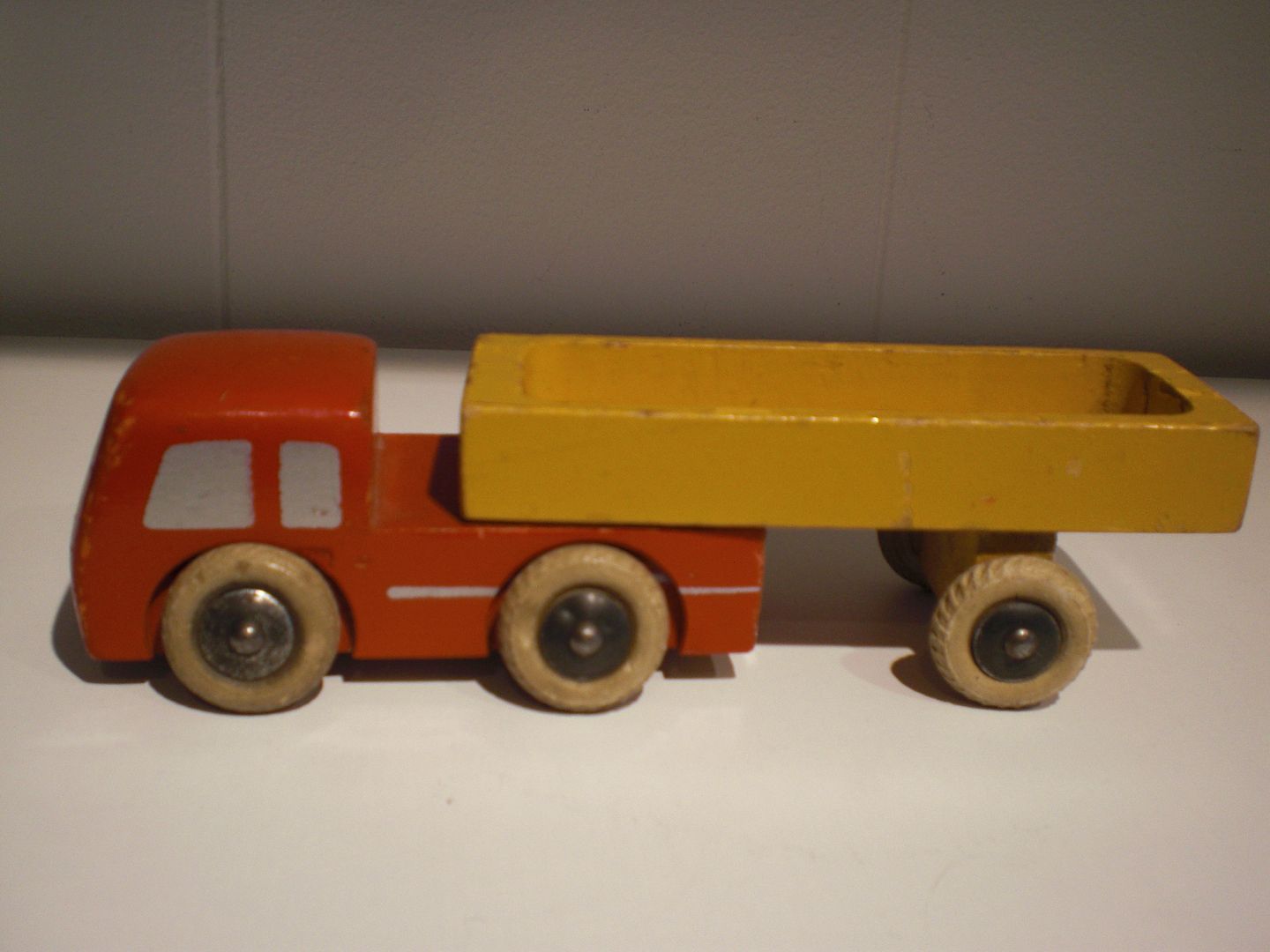Lille trælastbil med anhænger. Stemplet Trævarer Preben Poulsen, Mørkhøjvej 111, Herlev. Samlet længde: 20 cm. Højde: 5,4 cm - bredde: 5,2 cm. Ca. 1950. Med tidstypisk brugsslid.