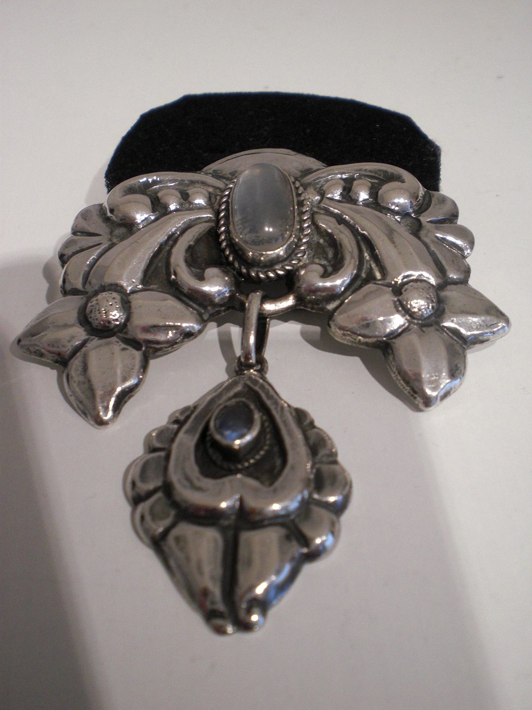 Skønvirke dobbeltbroche i 830 sølv med 2 cabochonslebne månesten. Stiliserede blomster og hængevedhæng. Uden sølvsmedestempel. Højde med vedhæng: 6,4 cm. - bredde: 5,7 cm.
