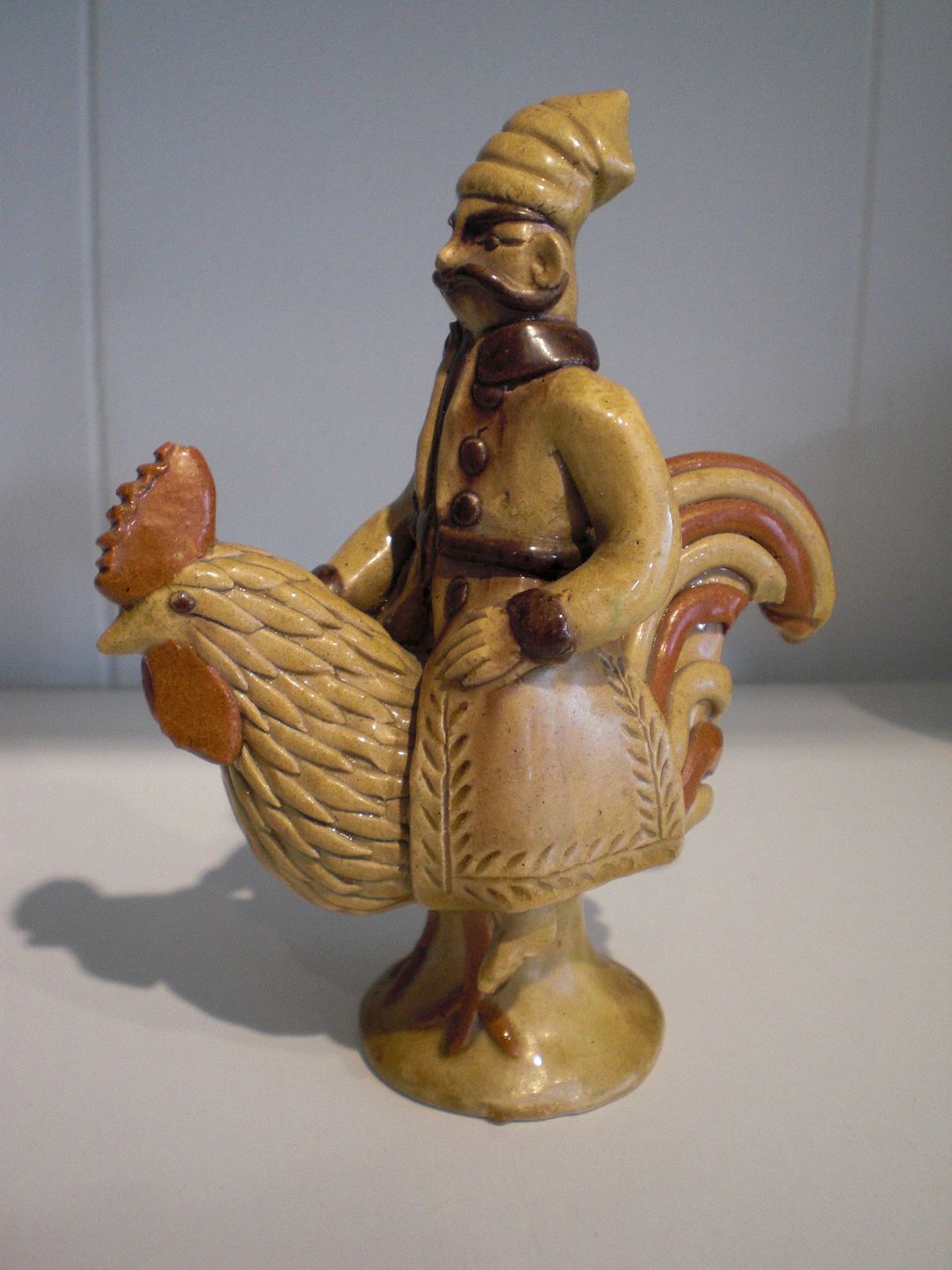 Polsk lertøjsfigur af "Kropnek på hanen" figur fra et polsk folkeeventyr - han flygter fra sin stride kone på en hane. Højde: 14,5 cm. Bredde: 13 cm.