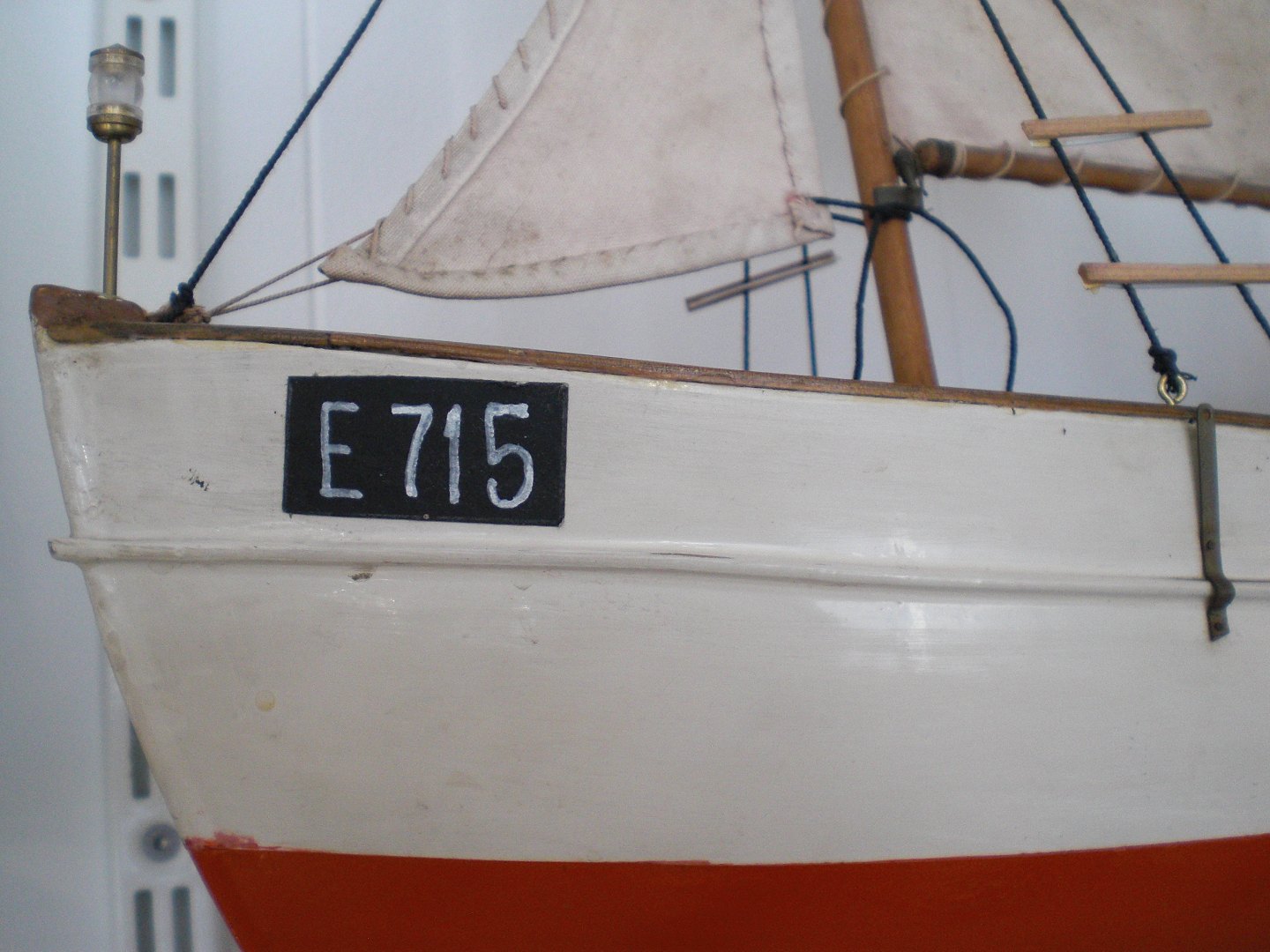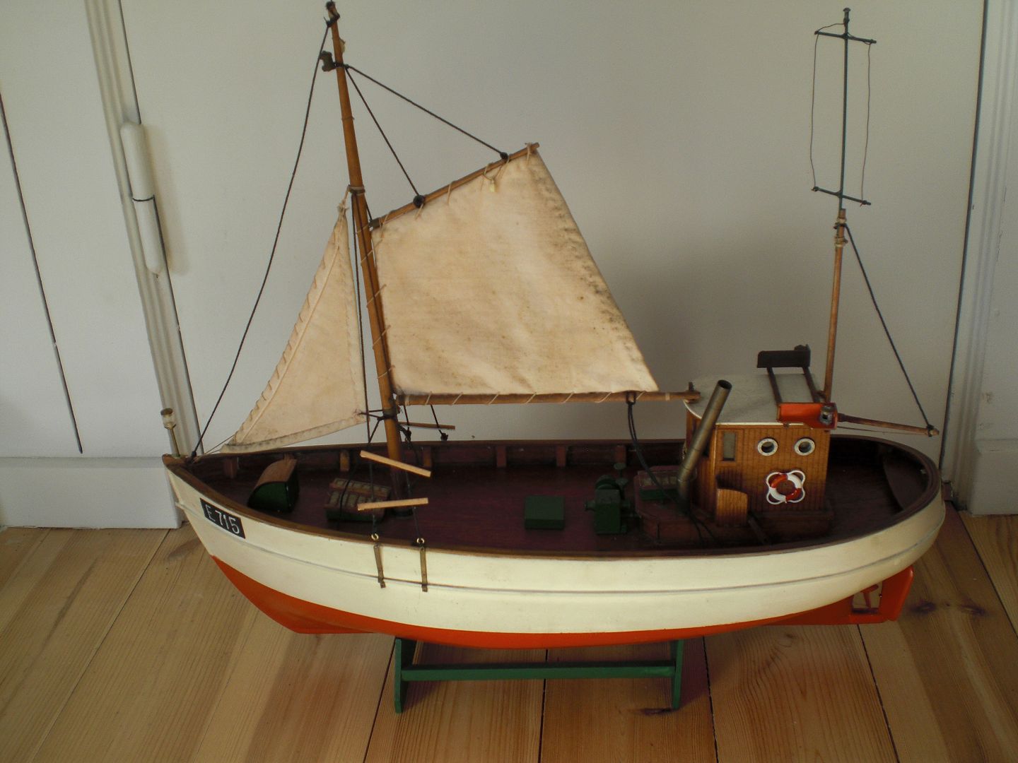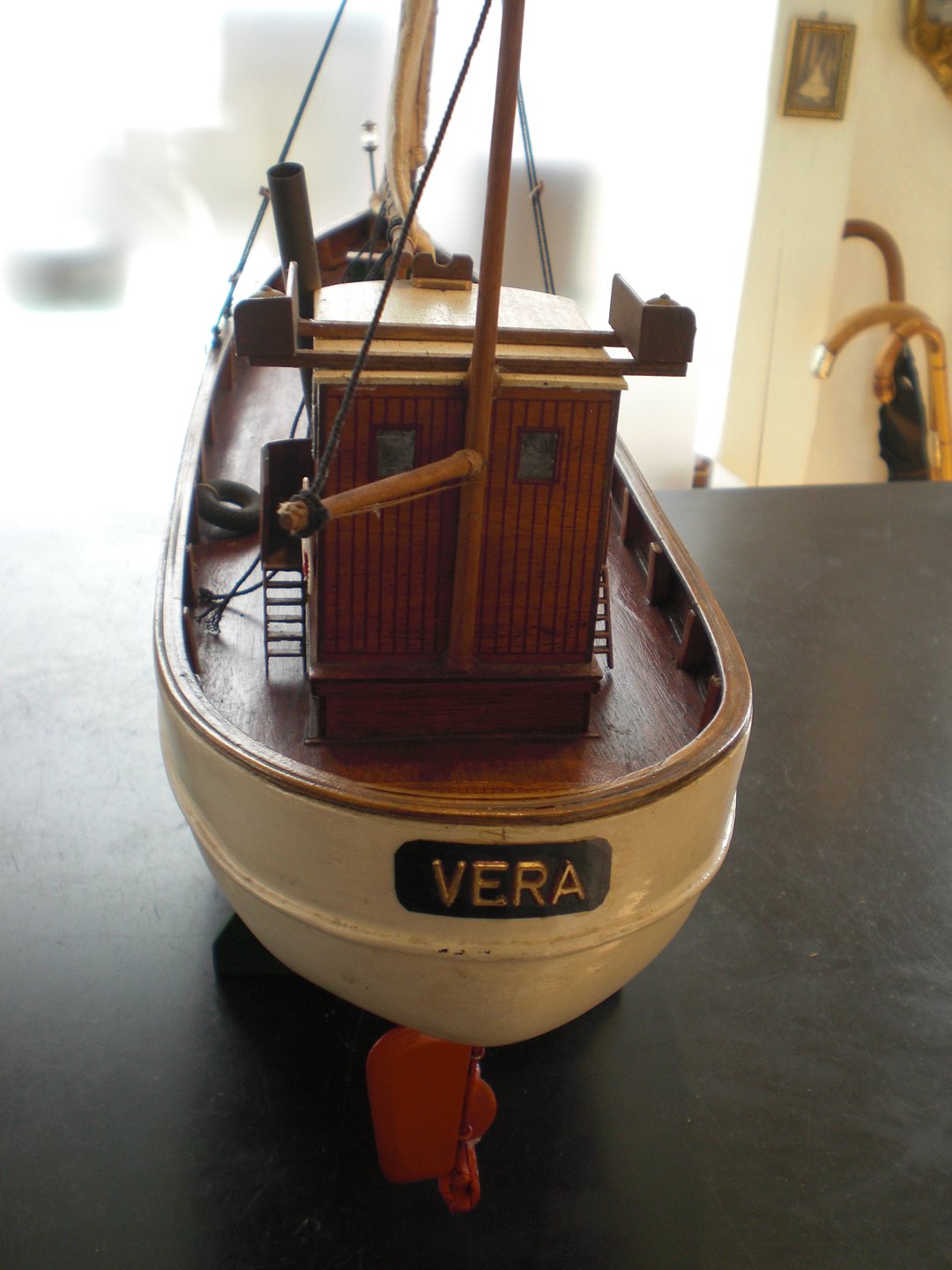 Håndbygget model af fiskekutteren Vera E 715 med små sejl. Formentlig fra 1950-erne. Meget detaljeret. Fremstår i pæn stand med brugsspor. På løs stand. Samlet højde med stand 48 cm. Længde: 51 cm.