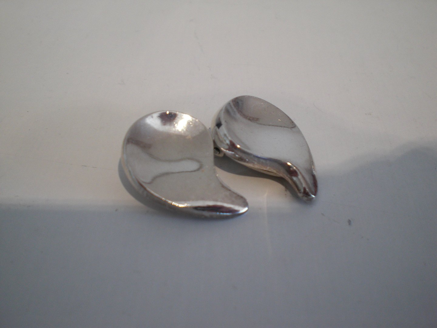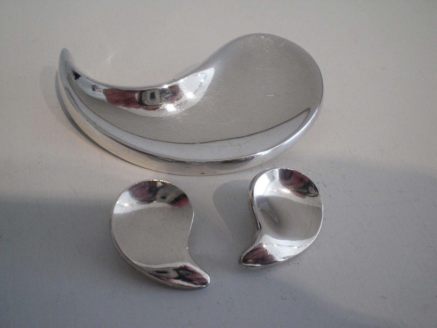 Karen Elisabeth Strand (1924 - 2000) broche og øreklips i sterling sølv udført hos Anton Michelsen ca. 1950. Samlet vægt: 34,5,4 gram. Brochens længde: Længde: 6,3 cm. - bredde: 3,4 cm. Længte øjeklips: 2,3 cm og bredde: 1,6 cm. I fin stand med megt let brugsslid. Sælges som sæt.