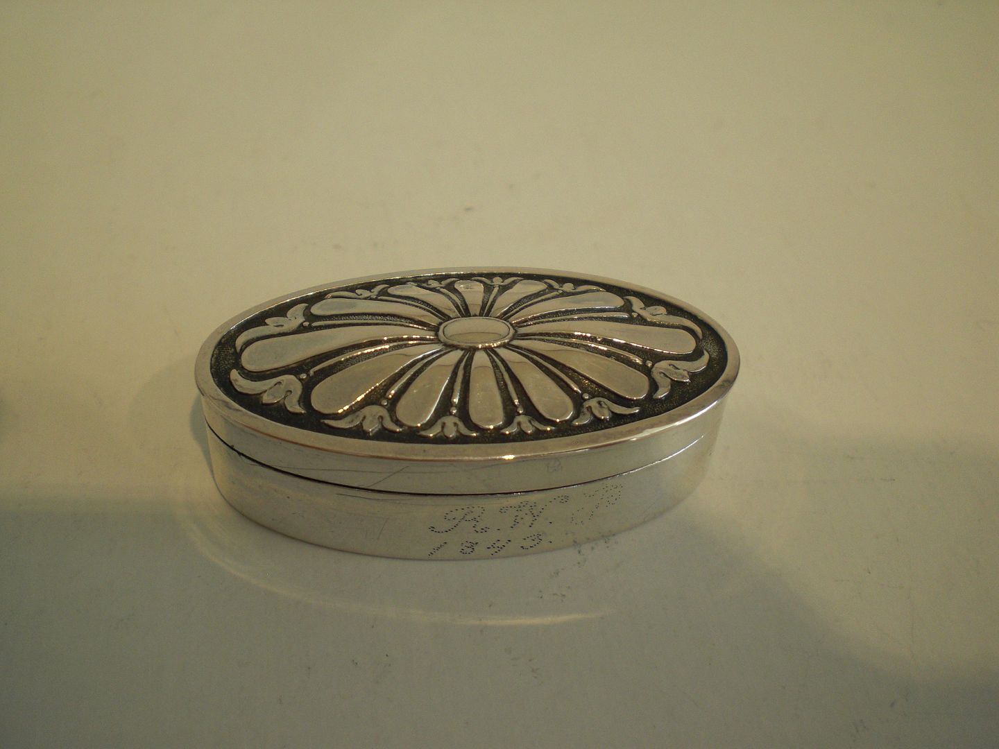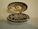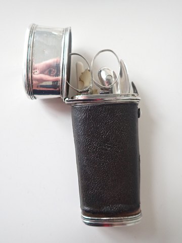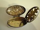 Sønderjydsk duftæske i sølv med stiliseret blomst på buet låg og undre gitter af mere naturalistiske roser. Stemplet med utydelig stempel formentlig Haderslev - mesterstemplet er ikke til at læse. Punslede initialer R. W. og 1843. Ænsken er tidligere på 1800-tallet. Mål: længde: 4,4 cm. - bredde: 2,4 cm. - højde: 1,5 cm. I fin stand med tidstypisk slid. Rep. 380 kr.