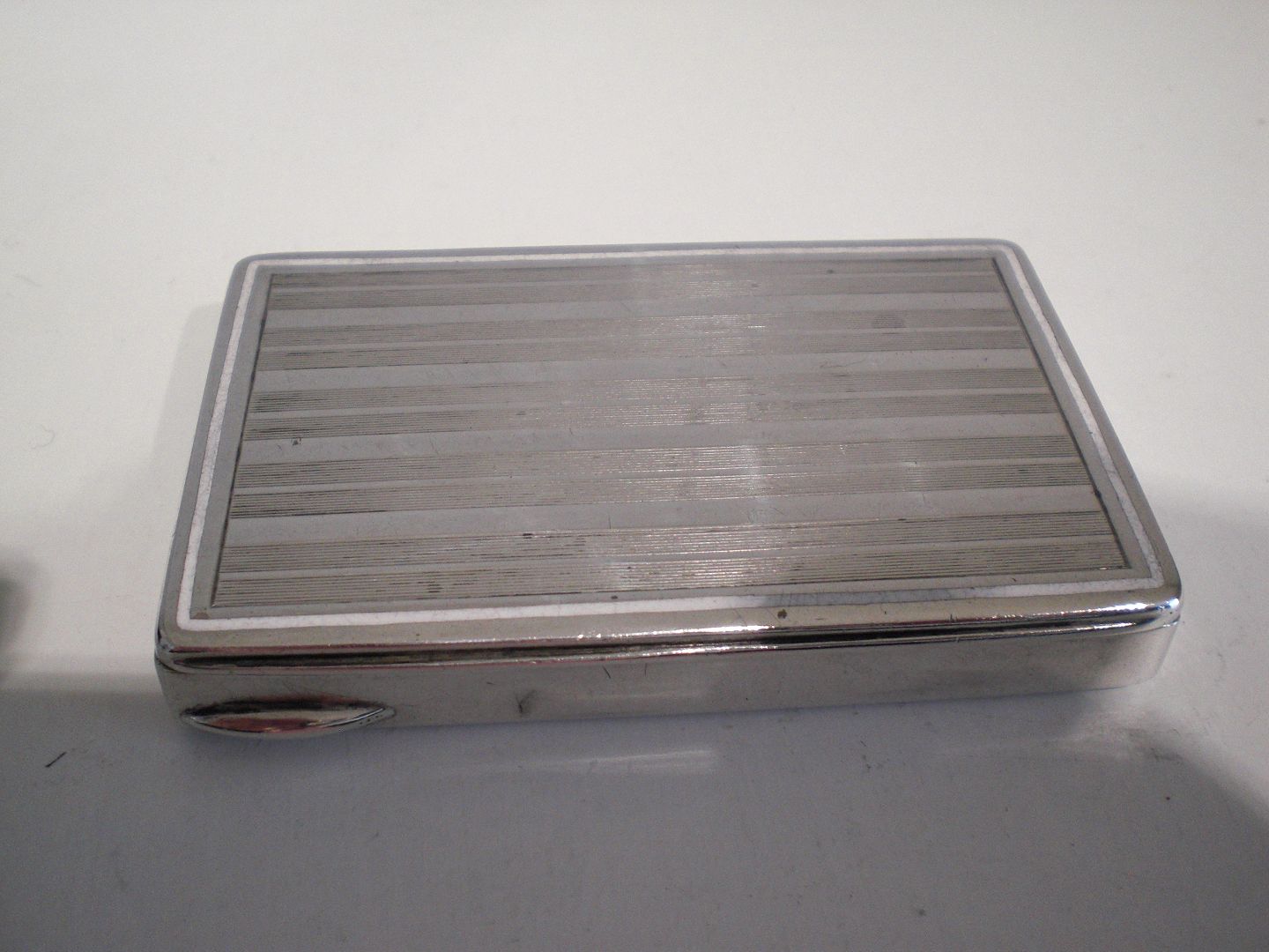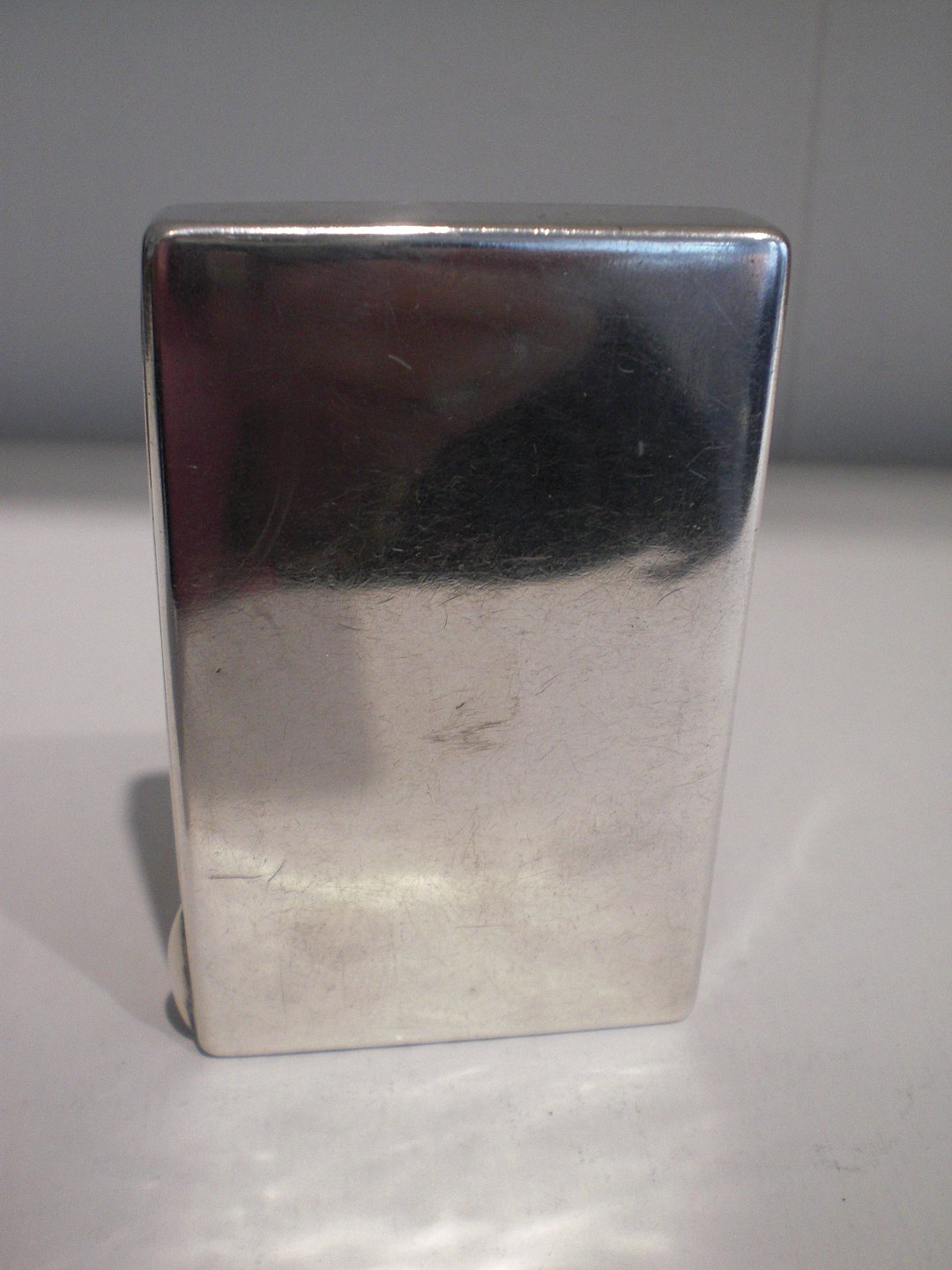 Rektangulær flad sølvæske med ciselleret lå og hvid emalje. Cigaretetui eller visitkortæske. Ustemplet men testet sølv. Forgyldt inderside. Ca. 1900. vægt: 84 gram. Højde: 1,2 cm. Længde: 7,9 cm. Bredde: 5 cm.