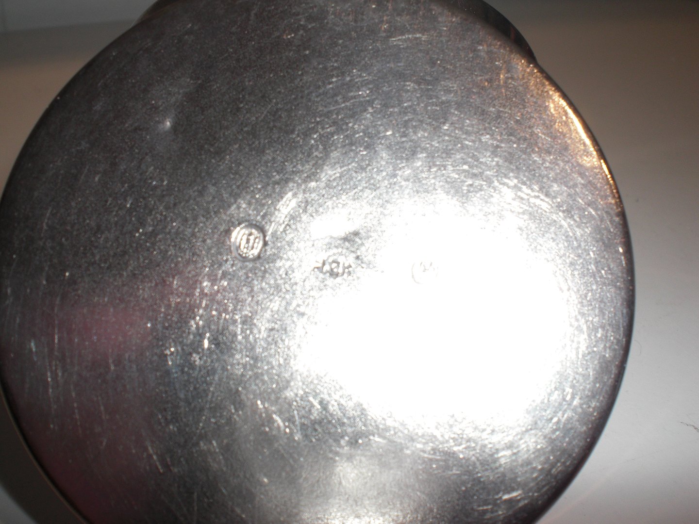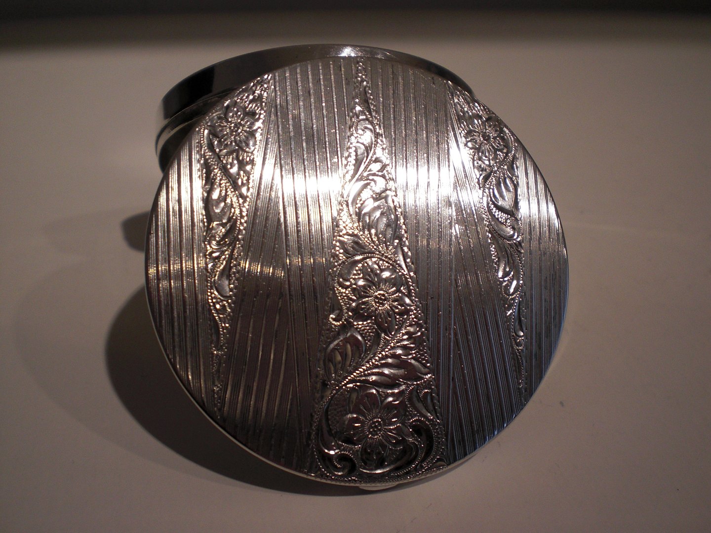 Flad, rund sølvæske med indre spejl (lille pudderæske?). Med cisilleret låg udført af Hugo Grün (1918 -1937) udført i 1927. Højde: 1,3 cm. Diameter: 5,9 cm.