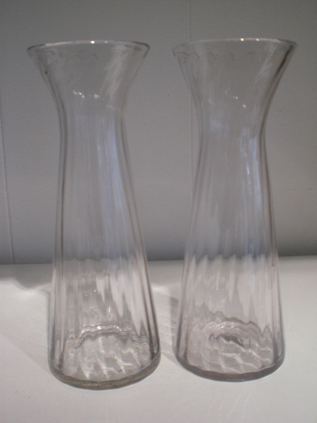 2 høje, klare, optisk vredne hyacintglas formentlig fra Holmegaard. Højde: 21,3 cm. 1880 -1920. .