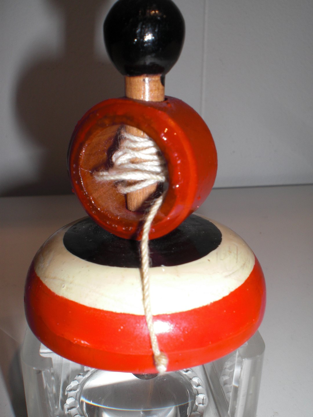Bemalet snurretop i træ med træksnor. Ukendt producent 1950 - 1960. Fin stand. Højde: 8 cm