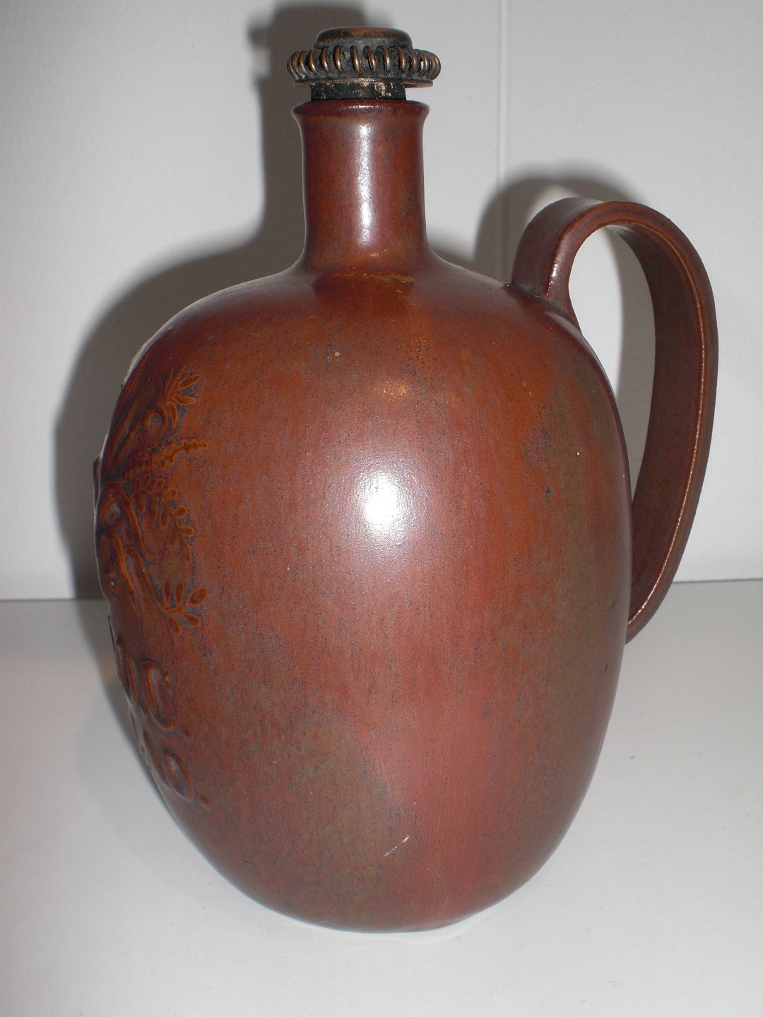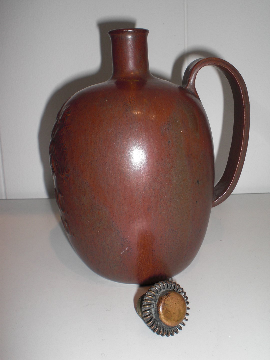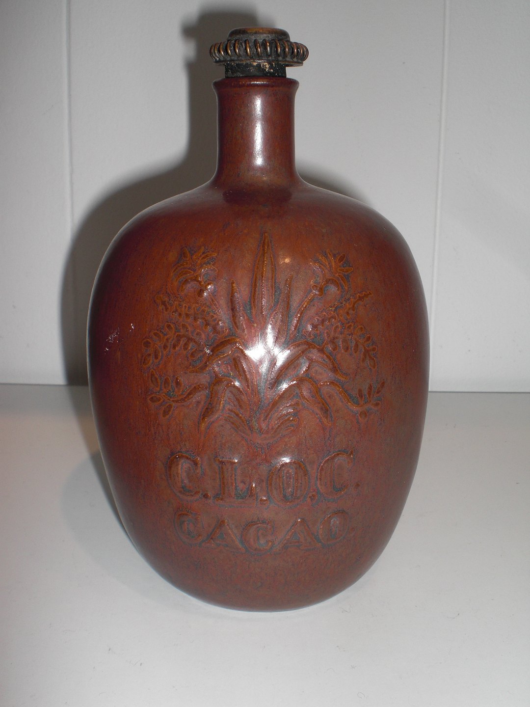 Arne Bang (1901 - 1983) stentøjs dunk med " C.L.O.C. Cacao" med bronzelåg skruet i prop og hank i brun hareplesglasur. Initialer AB. Højde uden låg: 16 cm. Diameter bredest uden hanken: 11 cm. I fin stand.