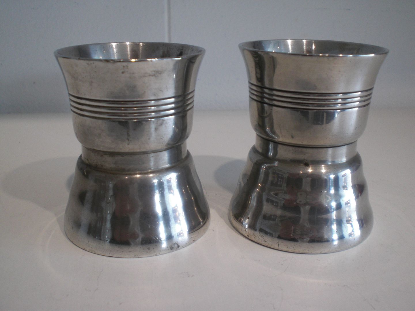 2 bægre/æggebægre i tin stemplet HB = Balling Eftf. 1916 og 1917. Højde: 6,5 cm - diameter foroven: 5 Vejenbogen om Ballins Værksted side 178 nr. 2. Sælges samlet. I fin stand.