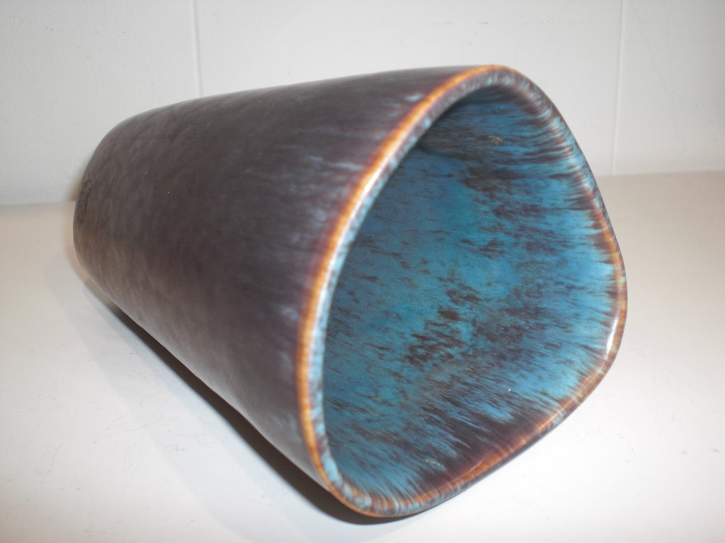 Gunnar Nylund (1904 - 1996) blødt, trekantet stentøjsvase, flammet glasur med blåt, jordrødt og gyldne farver udført hos Rørstrand (1940 - 1958). Signeret GN og ASK. Højde: 15 cm. Bredeste diameter: 4,5,6 cm. I fin stand.
