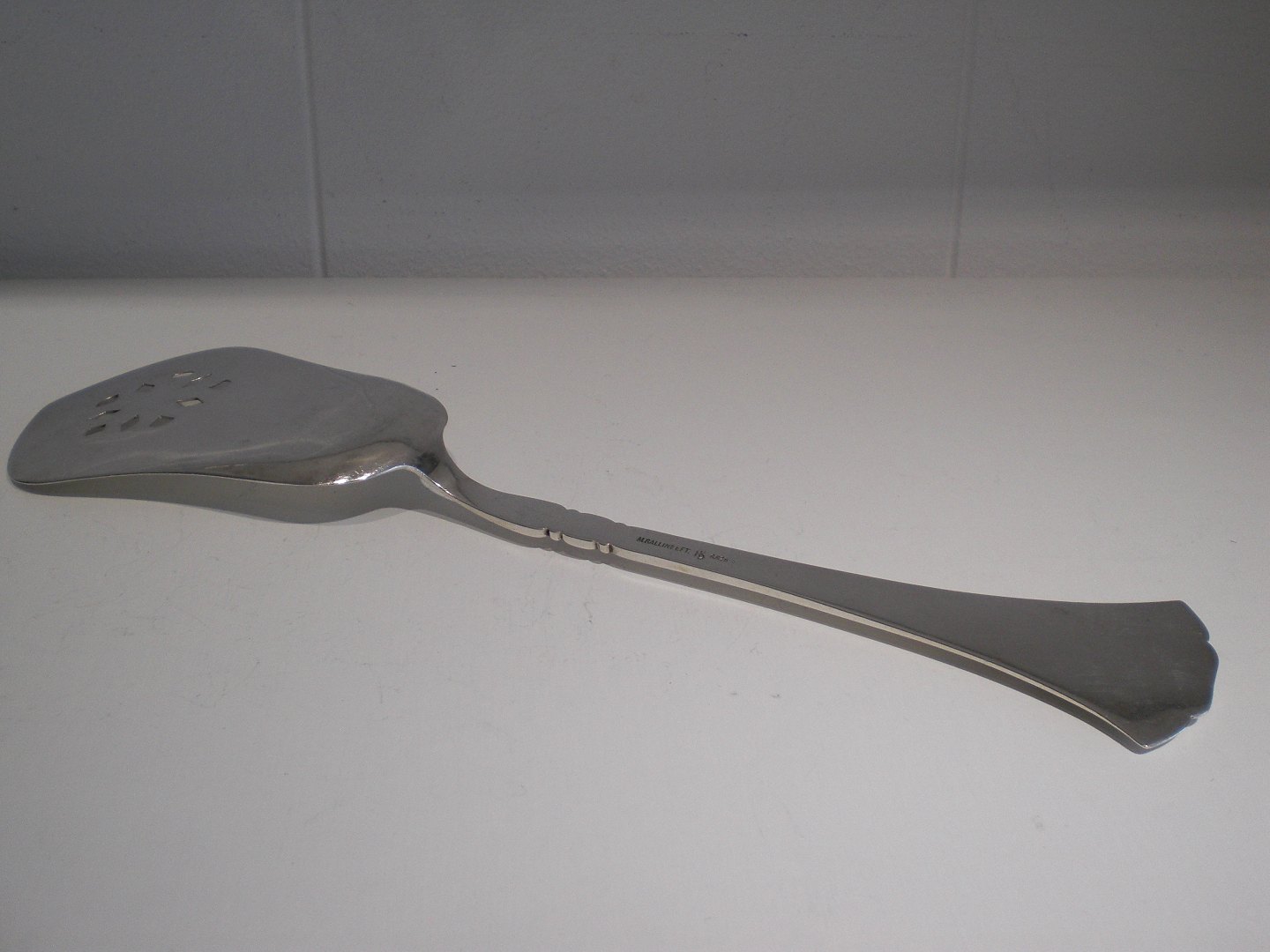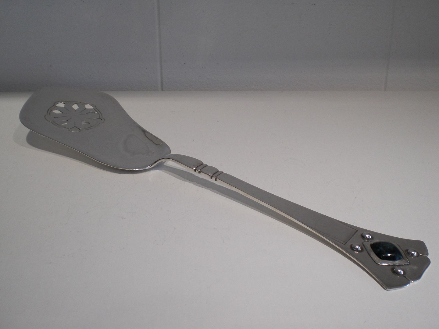 Mogens Ballins Eftf. skønvirke serveringspade i 826s sølv med gennembrudt laf og håndtag isat en grøn/blå halvædelsten. Stemplet " Mogens Ballins Eftf. HB 826s". Ca. 1910. Længde: 28 cm. Vægt: 98 gram. I fin stand med meget let brugsslid. Ikke medtaget i Vejen Bogen.