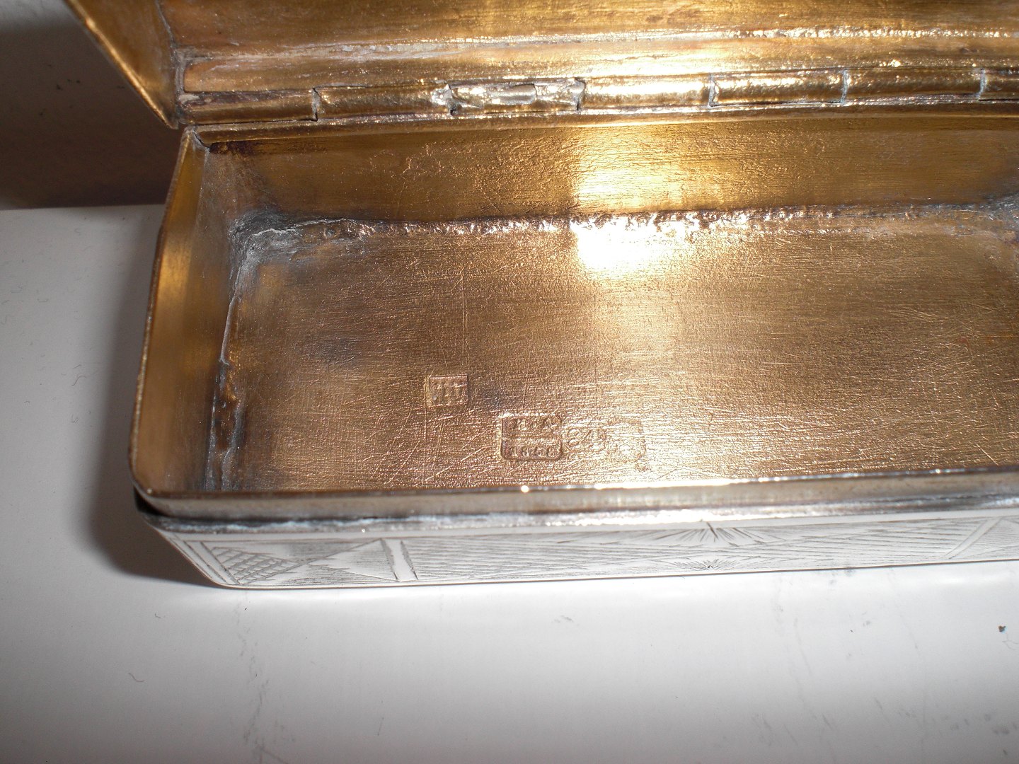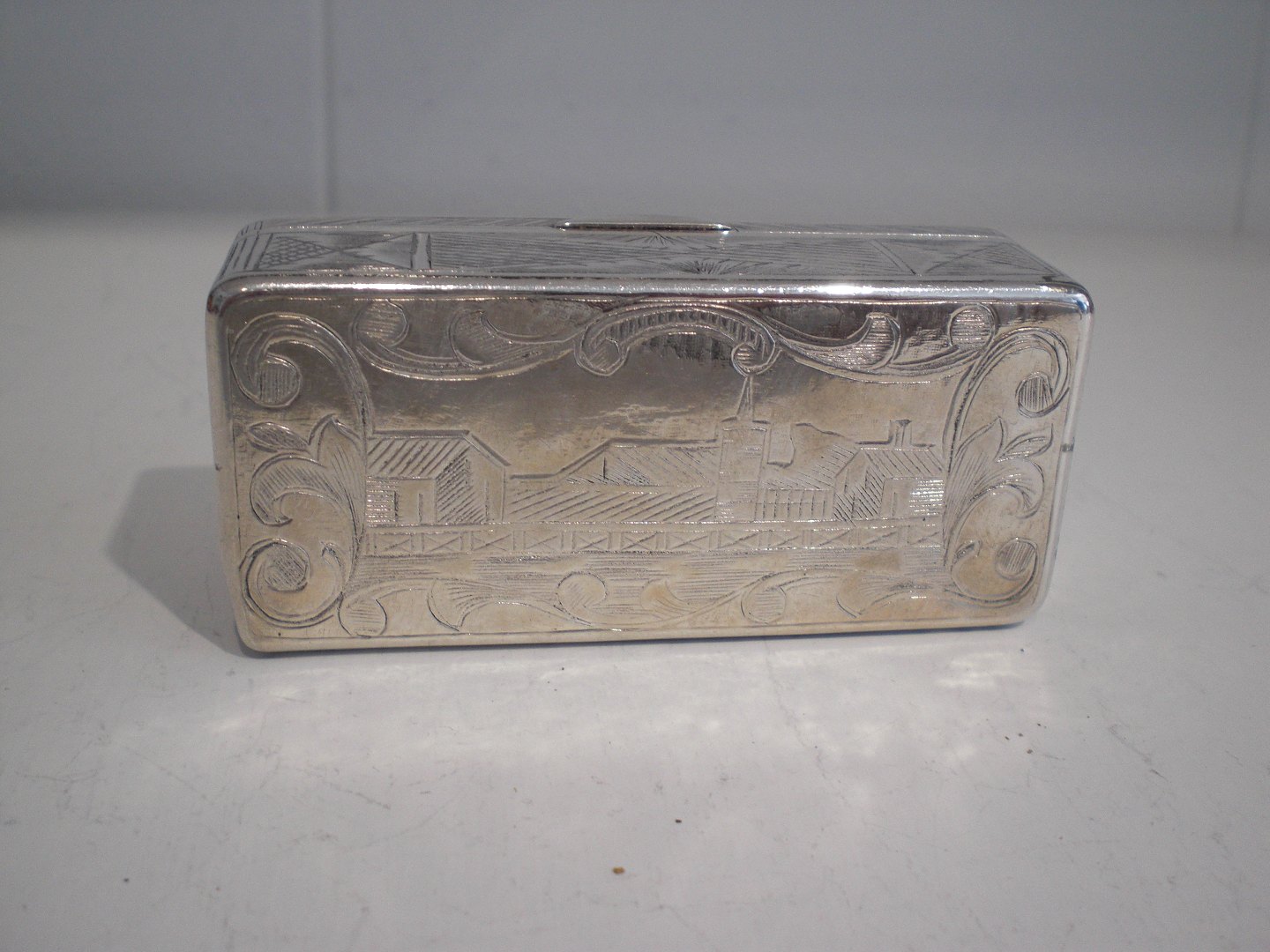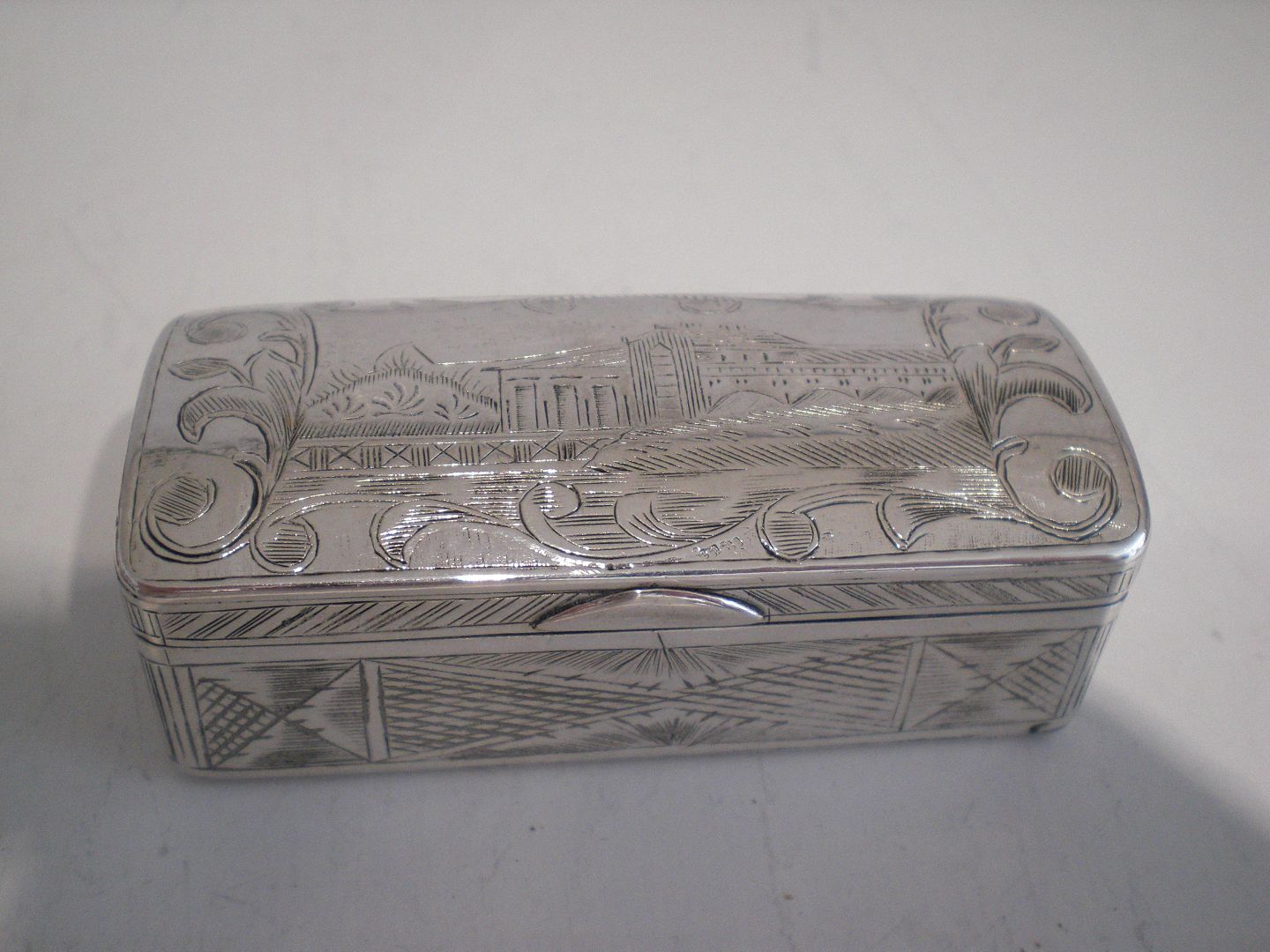 Vægtig russisk aflang sølvdåse (84 =0,875 sølv) fra 1858 - med svagt tydeligt mesterstempel, guareinstempel, lødighedsstempel og årstal i både låg og bund. Muligvis Ivan Vasileyvich Avdeyv, Moskva 1852 - 1862. Rundet låg, bygnings motiver i låg og bund og ornamentik på siderne. Gammel reparation i bud ellers tidstypisk brugsslid. Vægt: 72 gram. Mål: 7,3 x 3,3 x 2,5 cm.