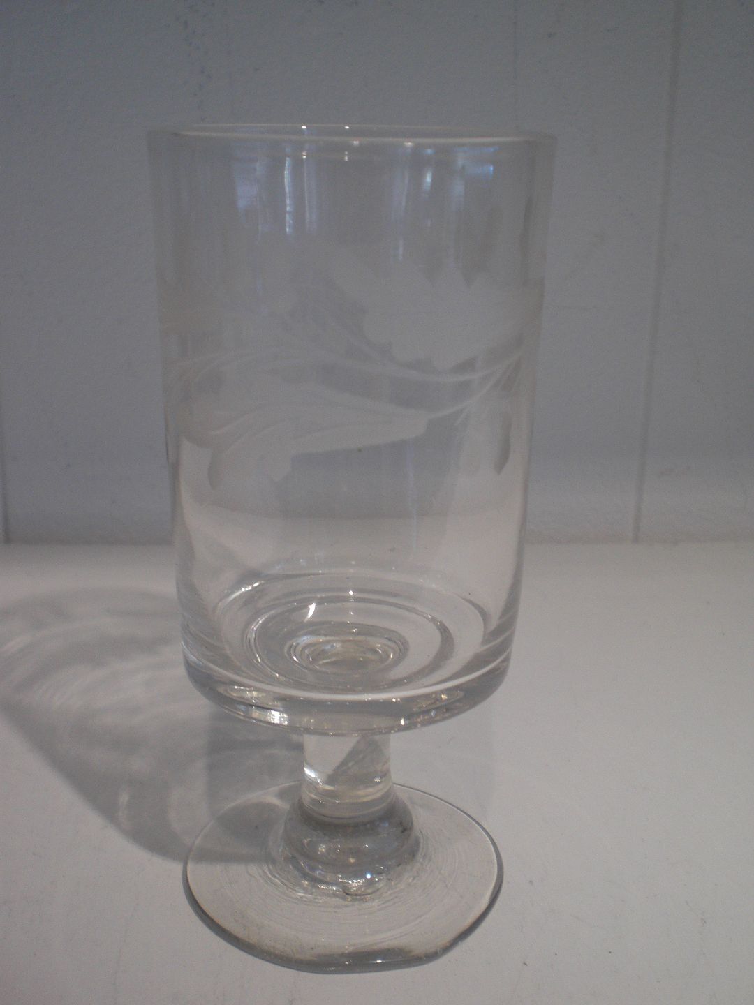 Holmegaard, Beatrice porterglas med egeløvsdekoration, 7 flige i blad, 2 agern, knap på stilk. Højde: 12,2 cm. Ca. 1870. Fin stand