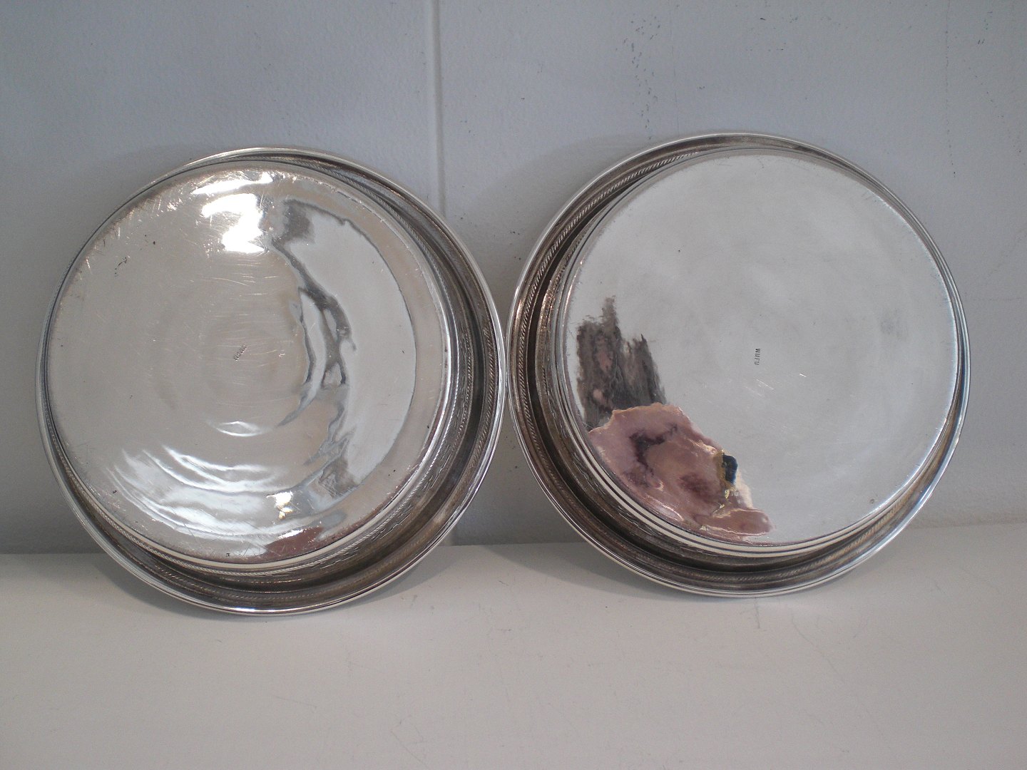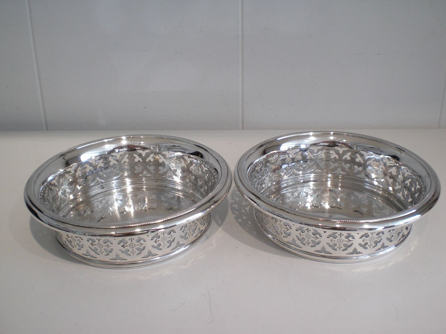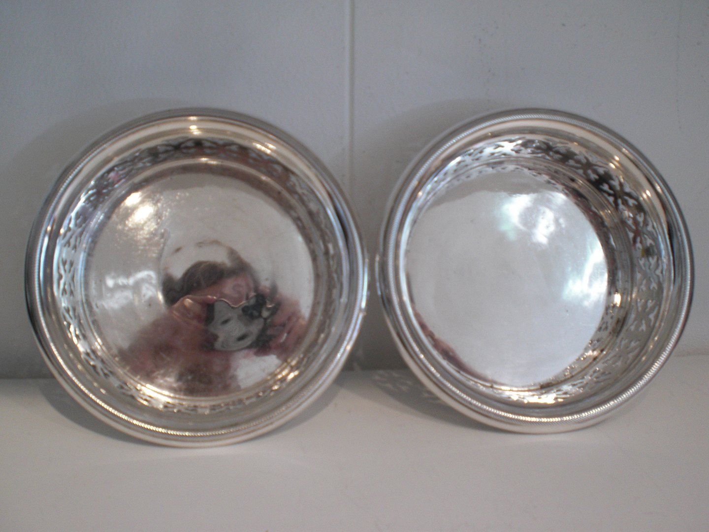 Et par tyske vinbakker i sølvplet, stemplet WMFM = Württembergishe Metallwarenfabrik (etb. 1853). Ca. 1950. Med gennembrudt mønstret kant, Diameter foroven: 14 cm. Diameter i bund: 11,8 cm. I pæn stand med let slid.