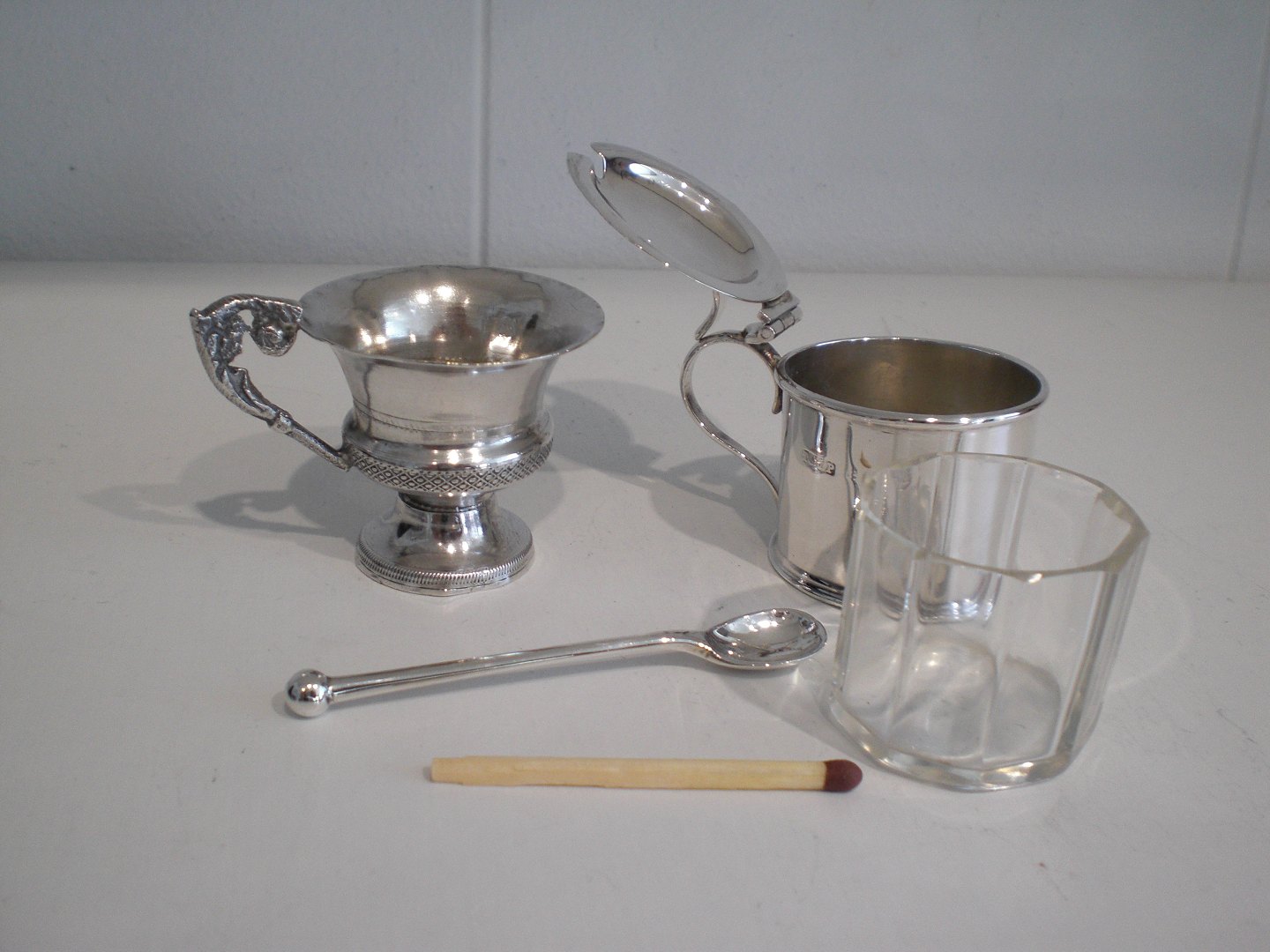 Lille Engelsk saltkar fra 1915 med facetslebet glasindsats i sølv - stemplet både i låg og kar T&JP= Joseph taylor & John Perry (1833 - ?), Birmingham. Medfølgende saltske er ustemplet. Vægt uden ske og glasindsats: 21,8 gram. Højde m. stjert: 4,3 cm. Diameter bund: 3,8 cm. I fin stand med alderstypisk slid. 400 kr. Stjålet.