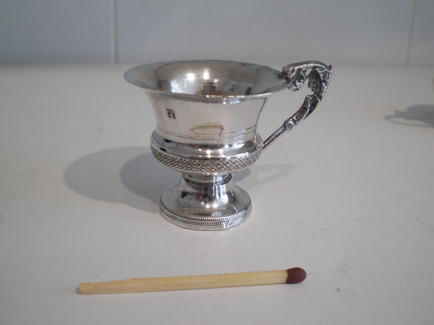 Russisk miniature vodka kop i sølv med mønsterdekoration 1800-tallet. Stempel ukendt 8,z ? og et kors. Højde: 4 cm. Diameter kop foroven u hank: 4,2 cm. Med hank: 5,5. I fin stand med tidstypisk slid. 275 kr.