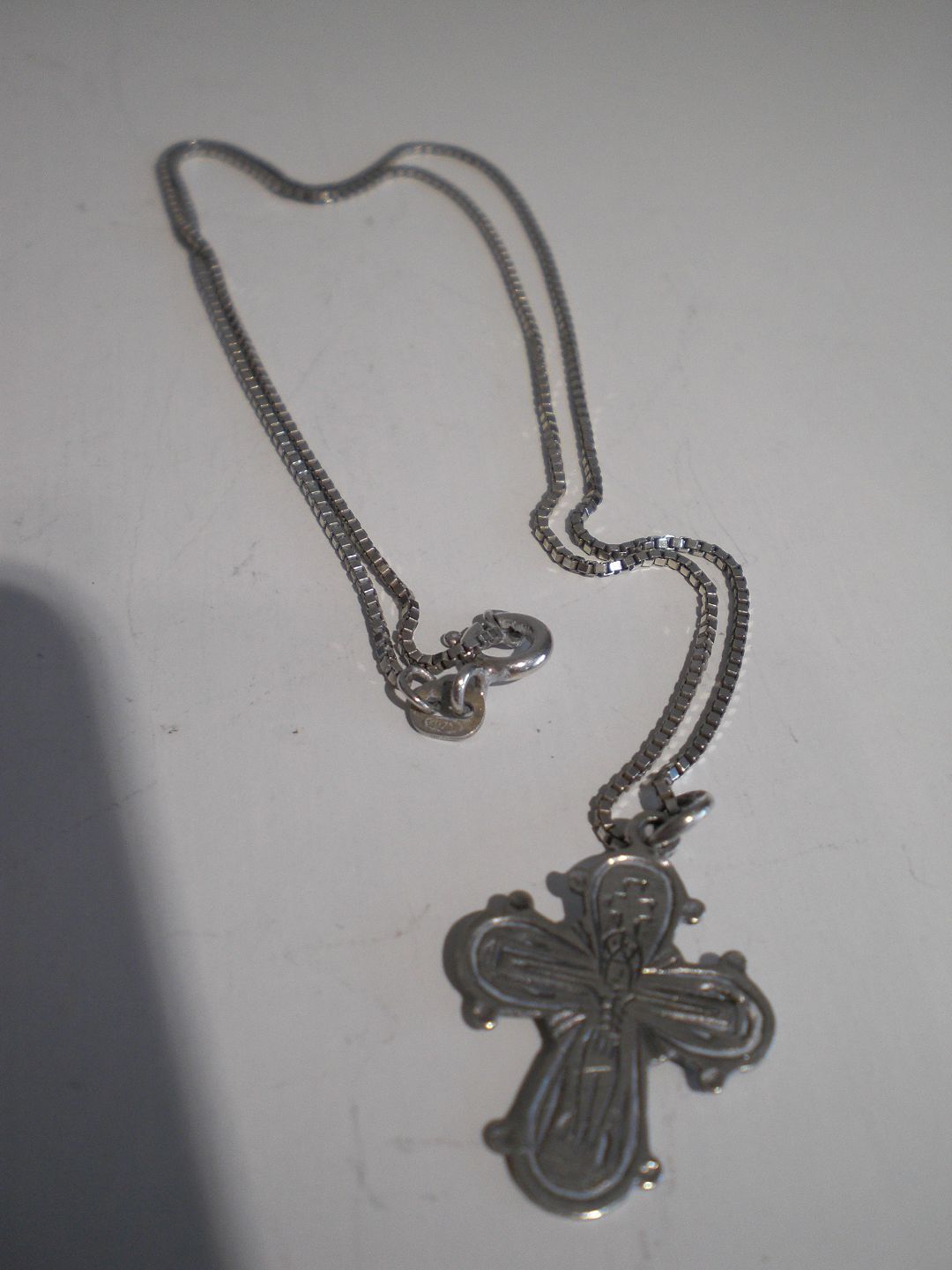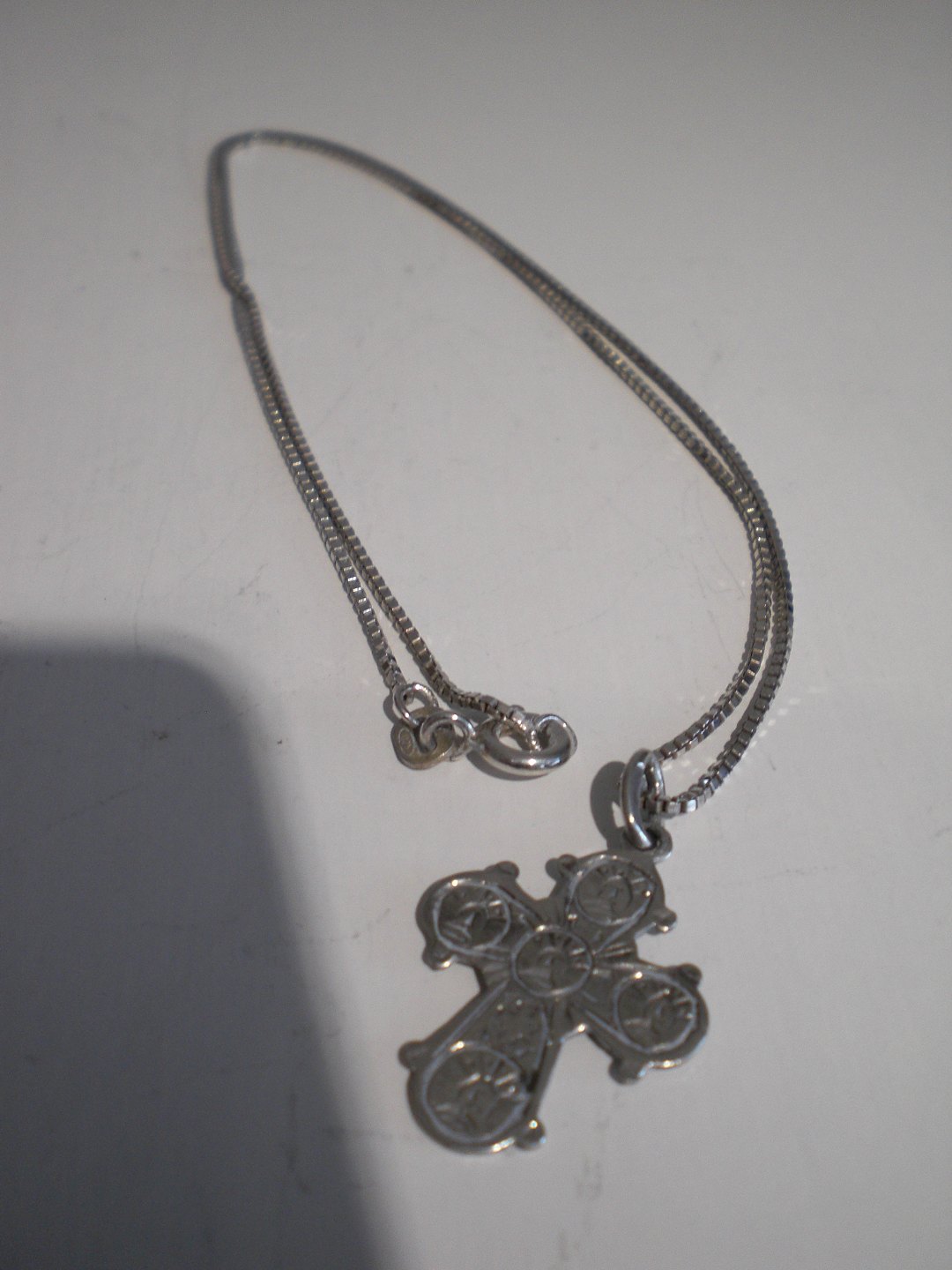 Lille dagmarkors med senere kæde i sterling sølv. Selve korset er i 830 søl udført af H&C = H.N.Hviid & Co., Kbh. (1893 -1937) - ca 1930. Kæden er Af Fritz Petersen, Kbh. fra 1950-erne. Samlet vægt 3,4 gram. Korsets højde: 2,5 cm. Kædelængde: 41,5 cm. I fin stand.