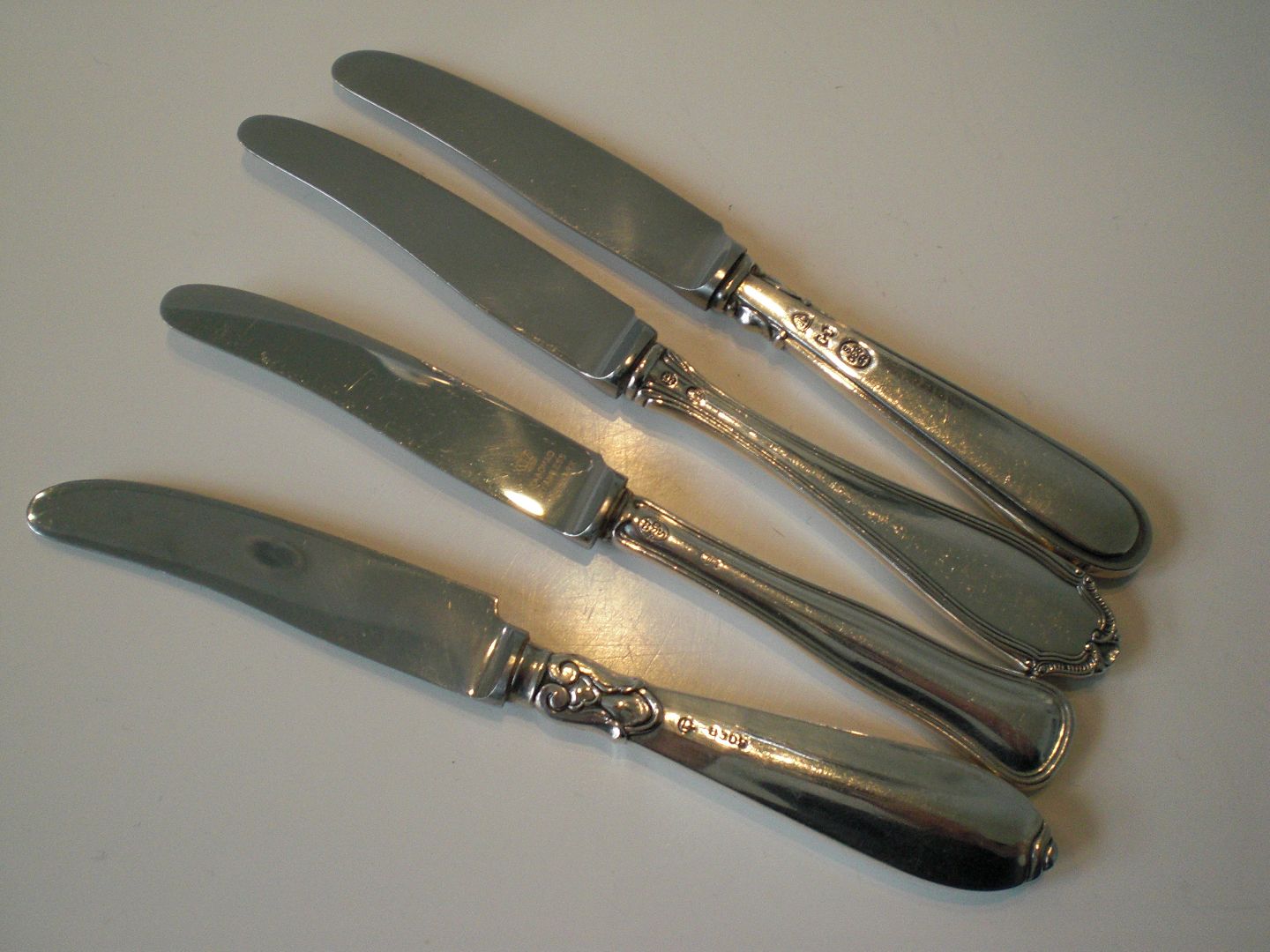 4 frugtknive med sølvskafter og stålblade.
