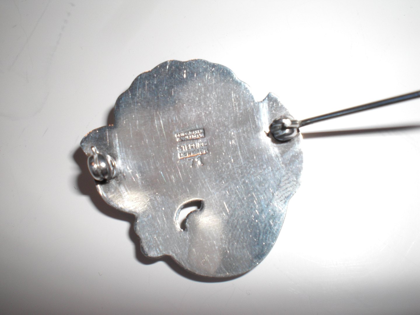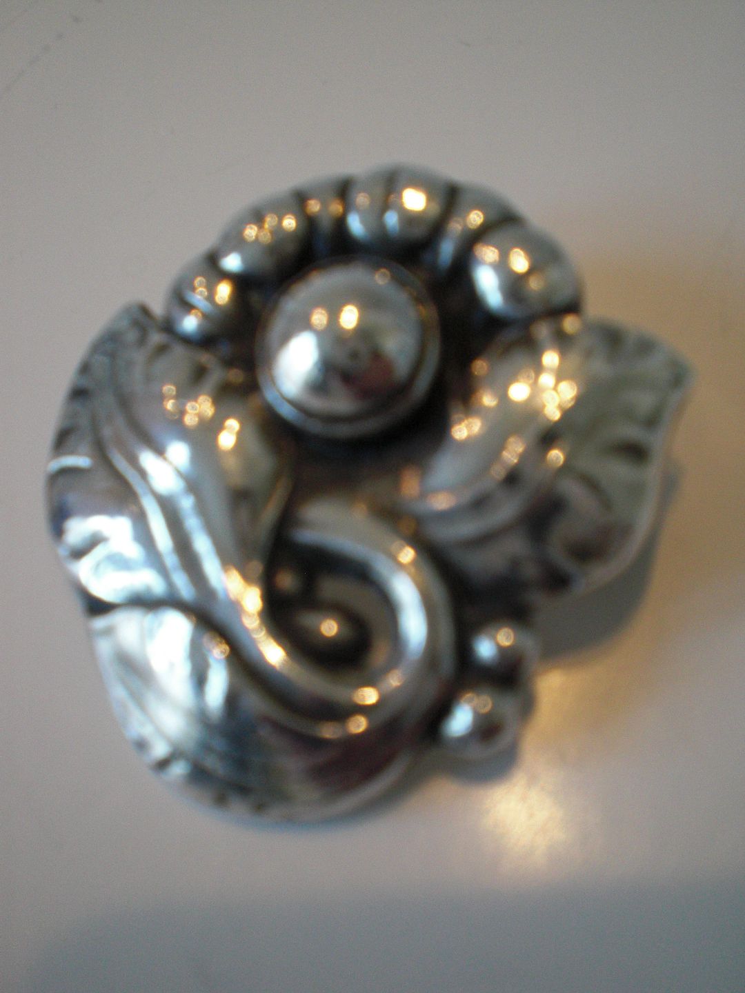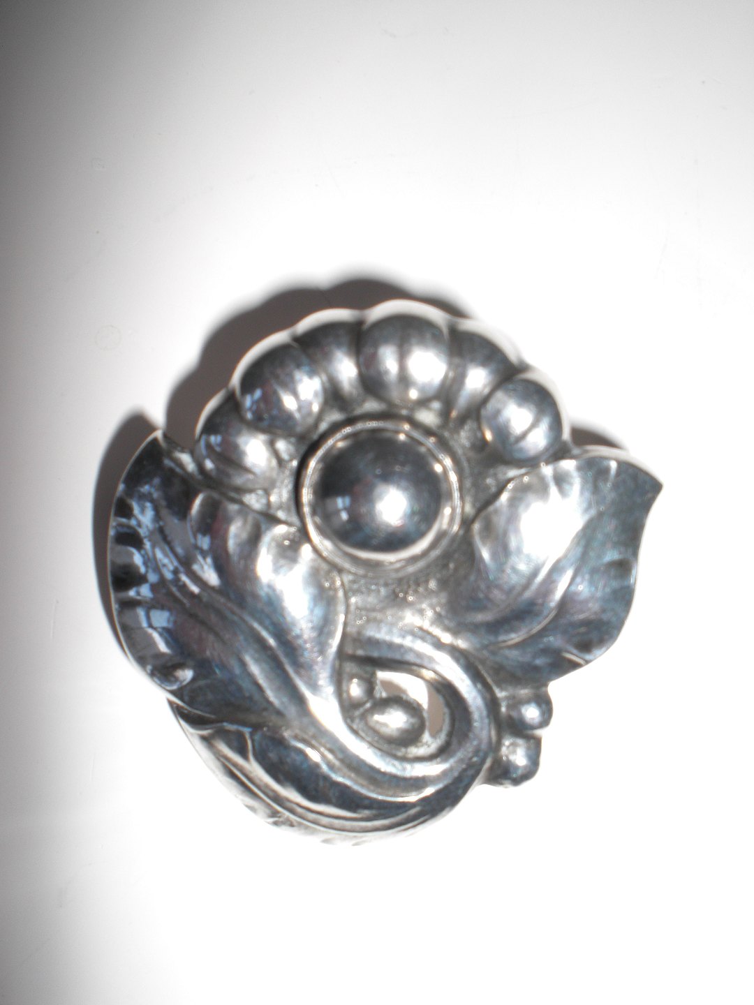 Georg Jensen og Wendel (1945 - 1952) - sterling sølvbroche med stiliseret blomst med stor sølvperle. Design: 71. Vægt: gram. Højde: 3,5 cm. Bredde: 3,4 cm. I fin stand