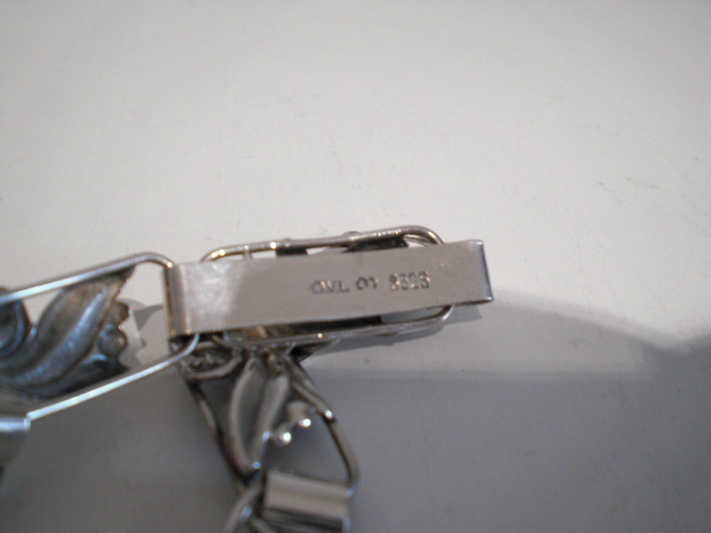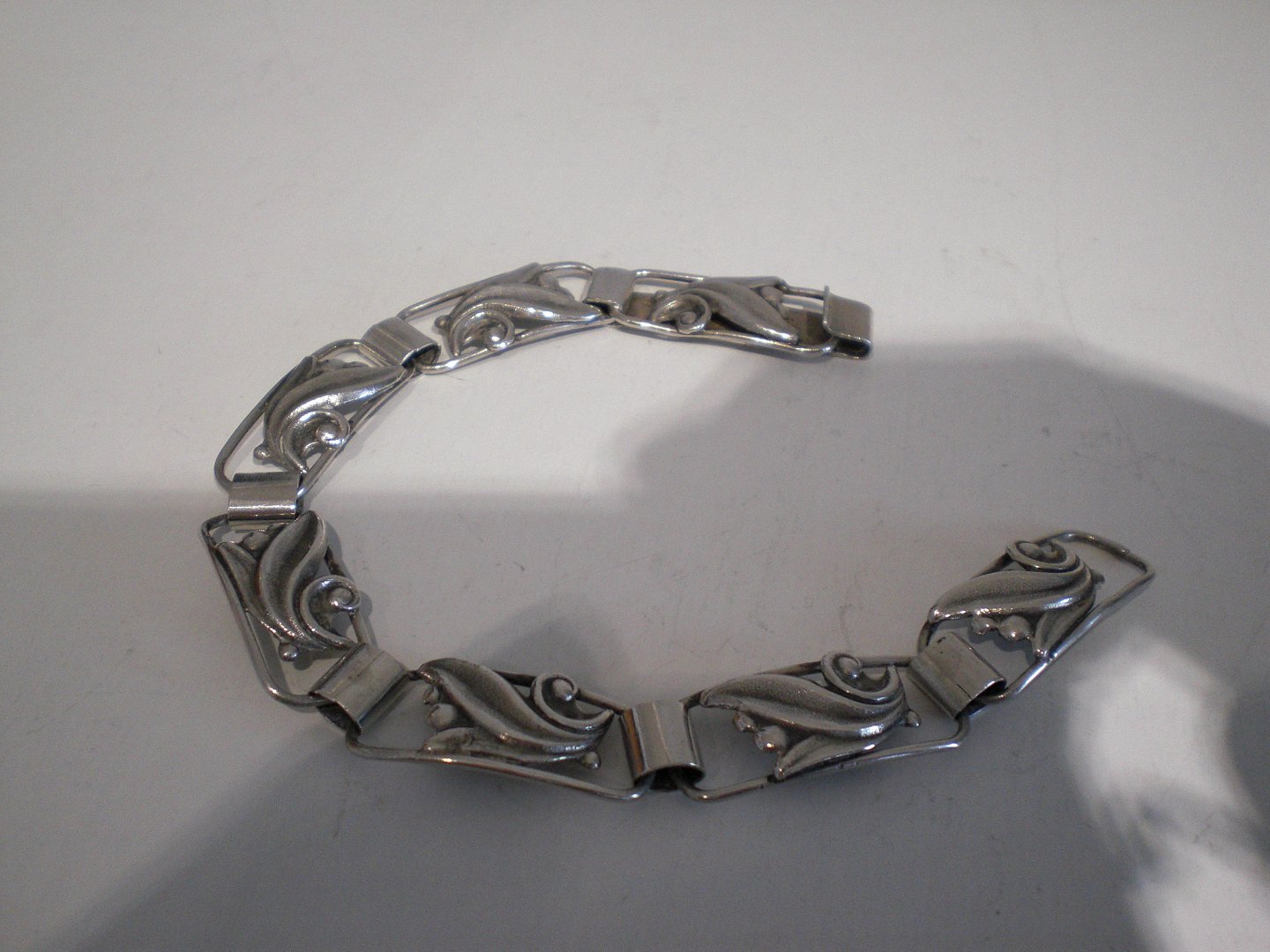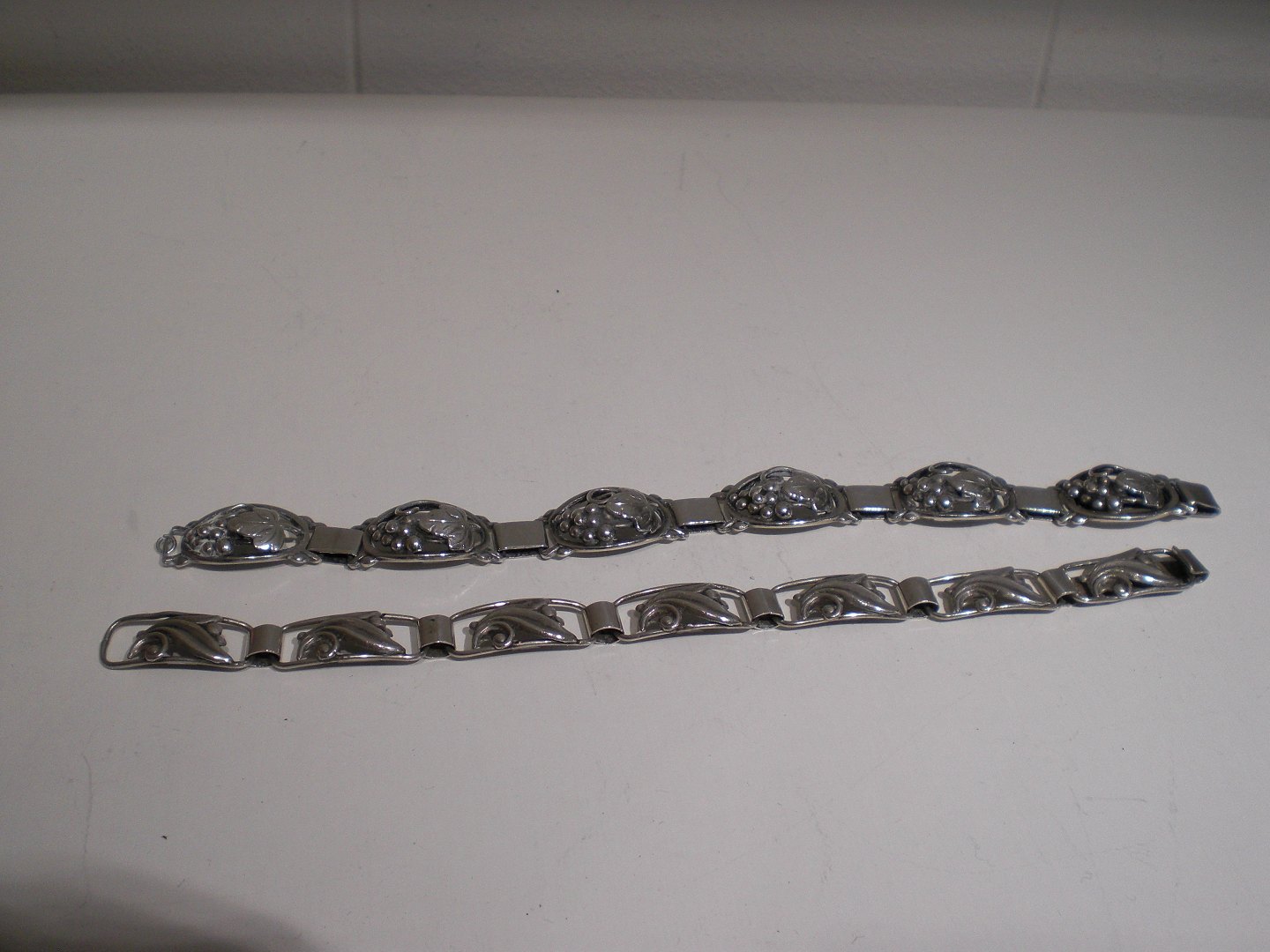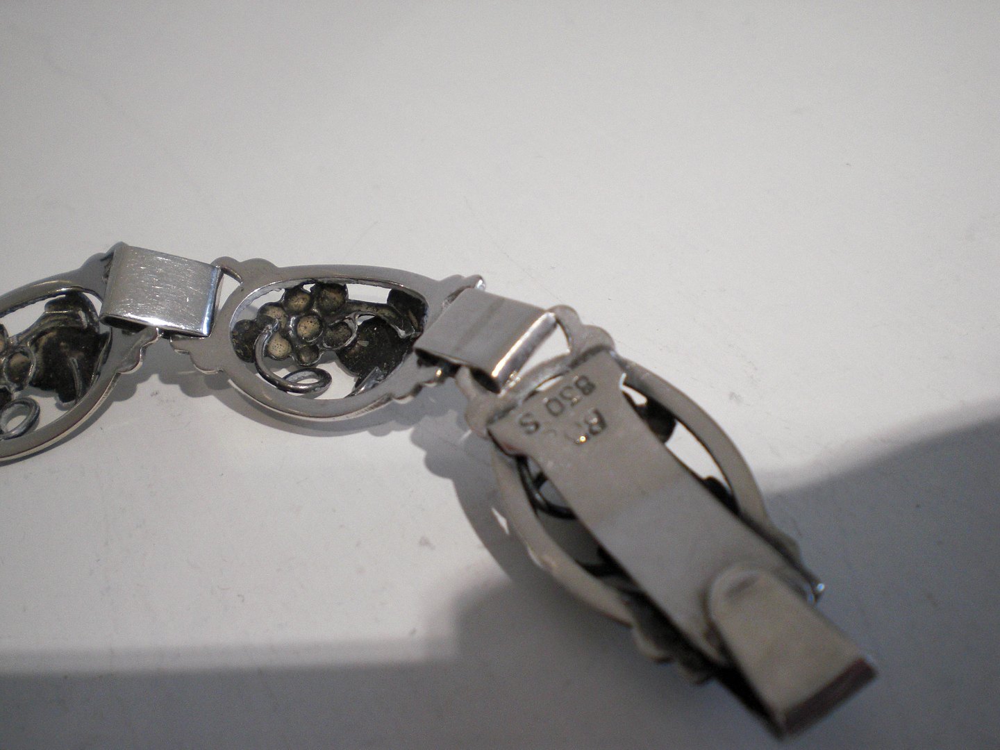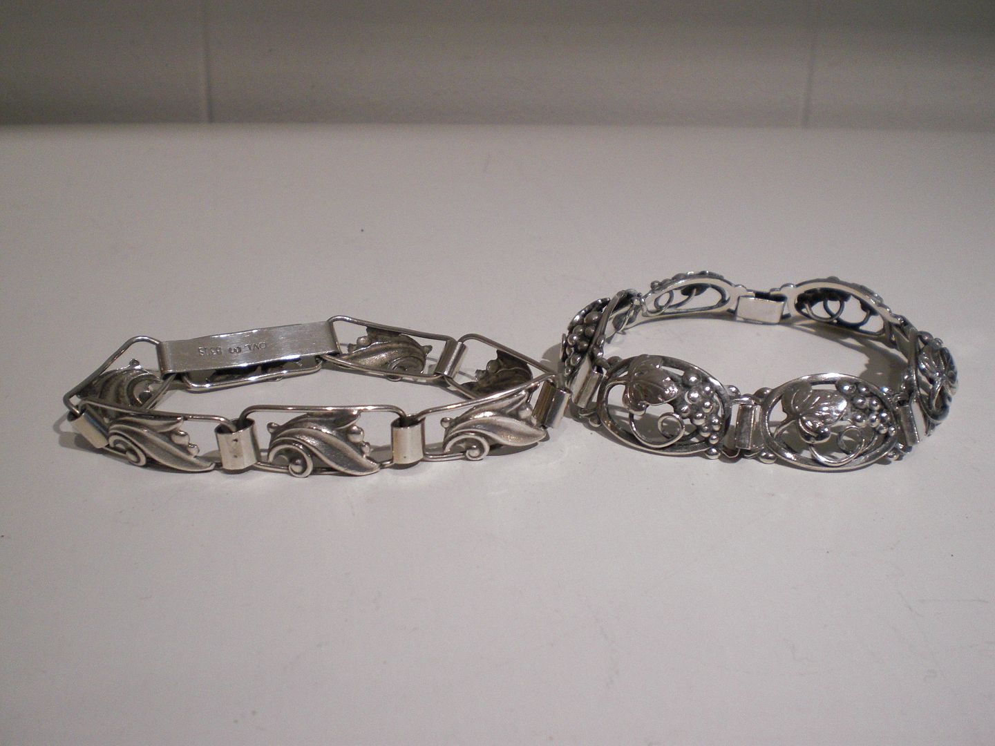 Til højre: Armbånd med drueklaser - udført hos BJ = I.B. Jensen Kbh (1905 -1937. Vægt: 22,3 gram. Længde: 19,9 cm. Bredde: 1,6 cm. Fin stand. Pris: 750 kr.