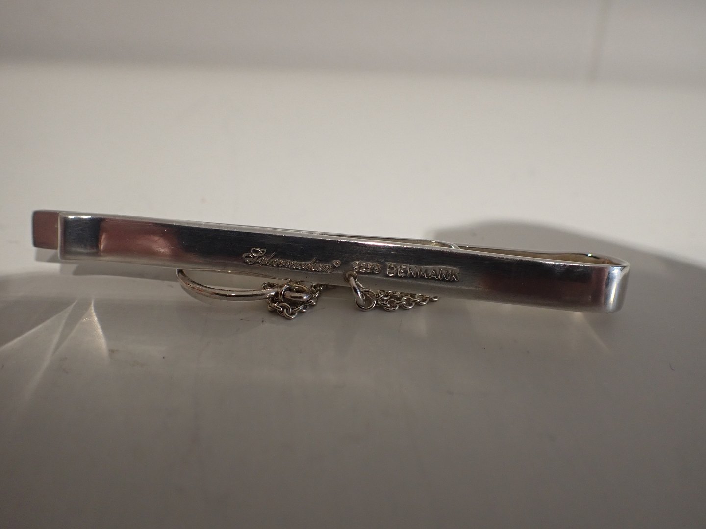 Sølvsmedien (1993 -2001), Kolding - glat slipsenål med sikkerhedskæde i sterling sølv, stemplet Sølvsmedien, 925, Denmark. Mål: 7 x 0,5 cm. Vægt. 11,6 gram