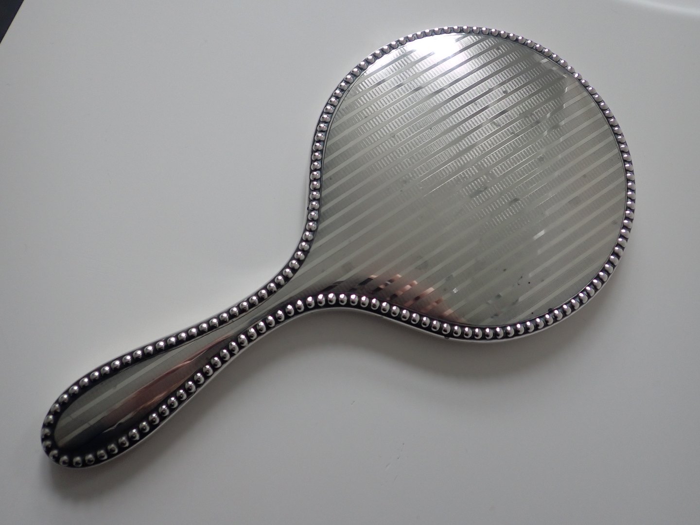 Joseph Warisch, Kbh. ( 1937 - 1948) - Håndspejl i 830 sølv med stribet, graveret dekoration og perlekant. Originalt spejlglas med sleben kant. Stemplet J.W., 830 S. Længde: 26,8 cm. Bredde: 14,5 cm. Pæn stand med tidsvarende brugsslid.