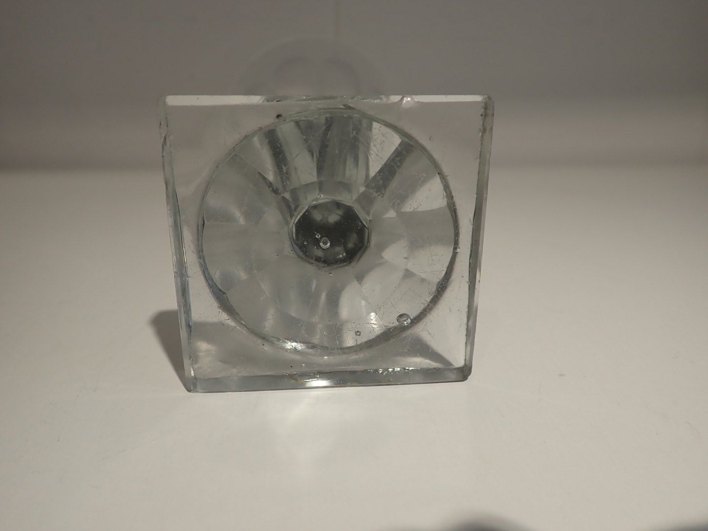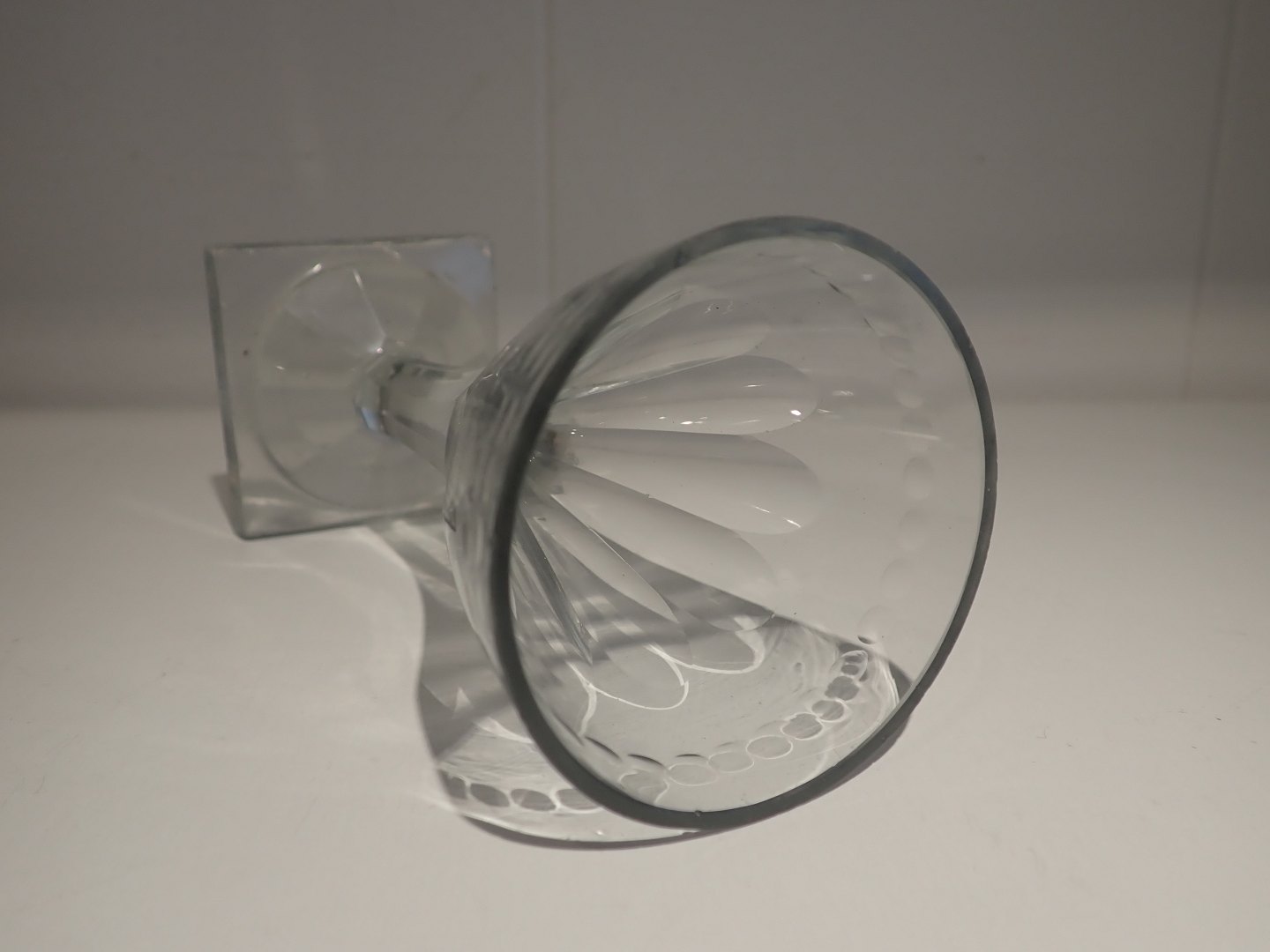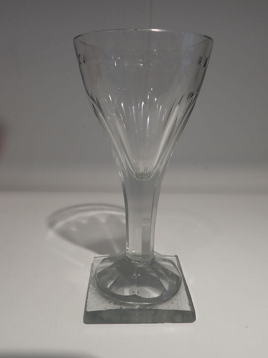 Svensk vinglas på firkantet fod med kantslibning og facetslibning på glassets bund og fod. Sleben puntelmærke. Ca. 1850. Højde: 13,4 cm. I tidstypisk stand med brugsslid.