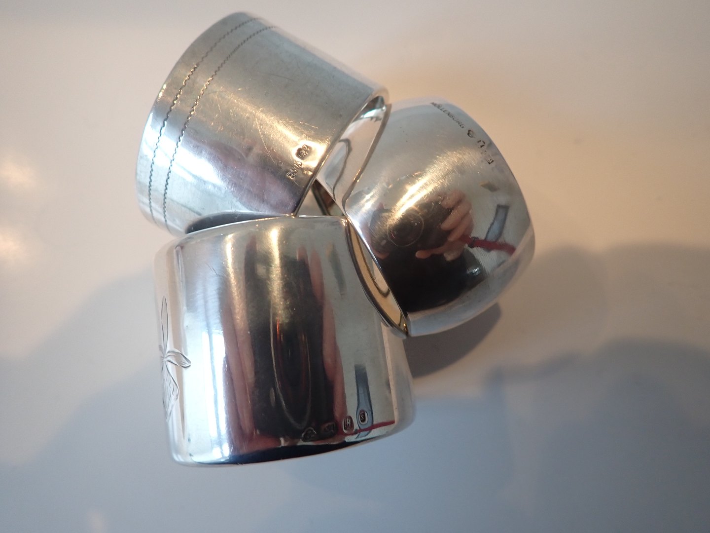 3 servietringe i 830 sølv - 2 svenske til henholdsvis 350 og 400 kr. En dansk med julen 1909 og initialer indgraveret til 150 kr.