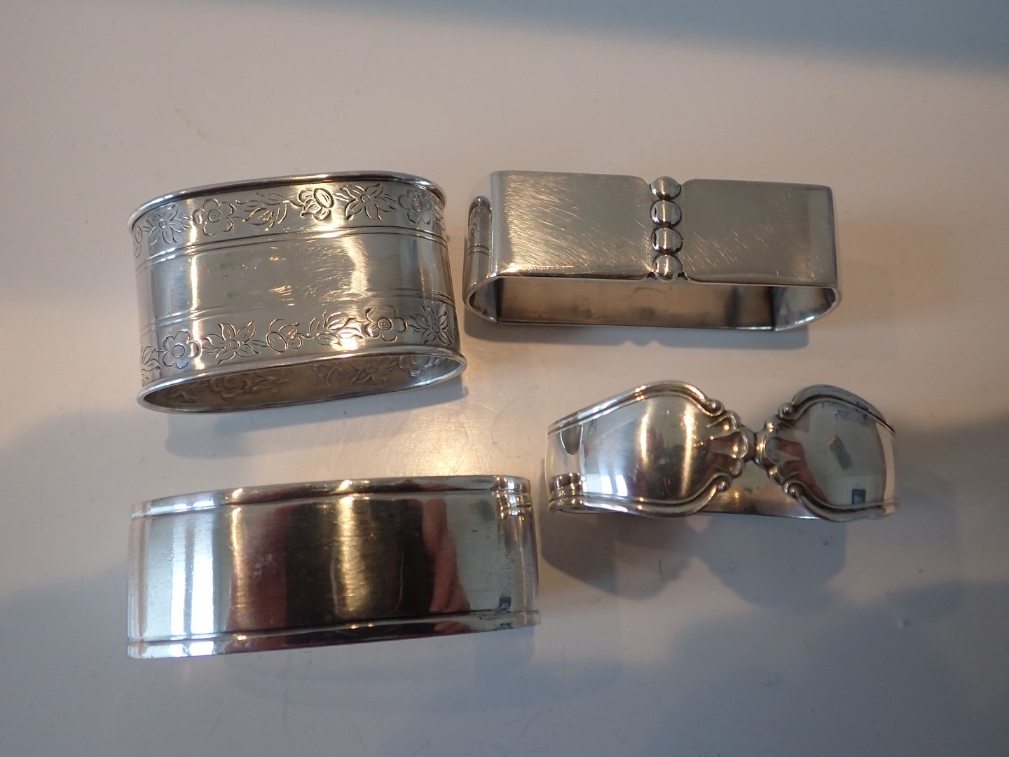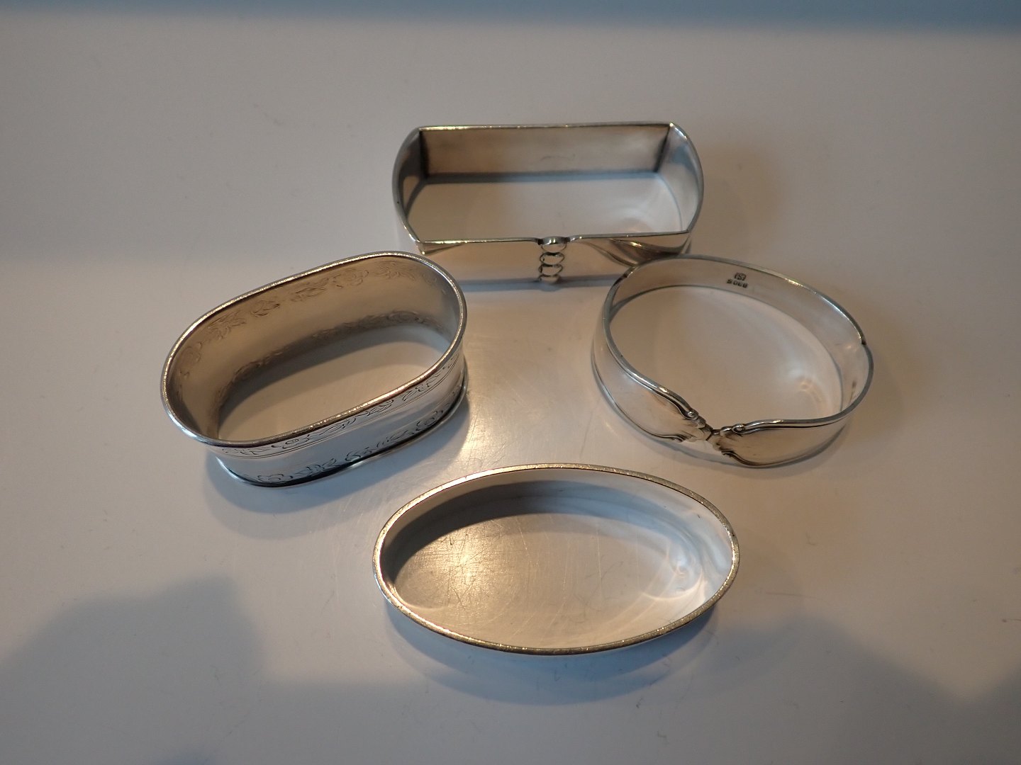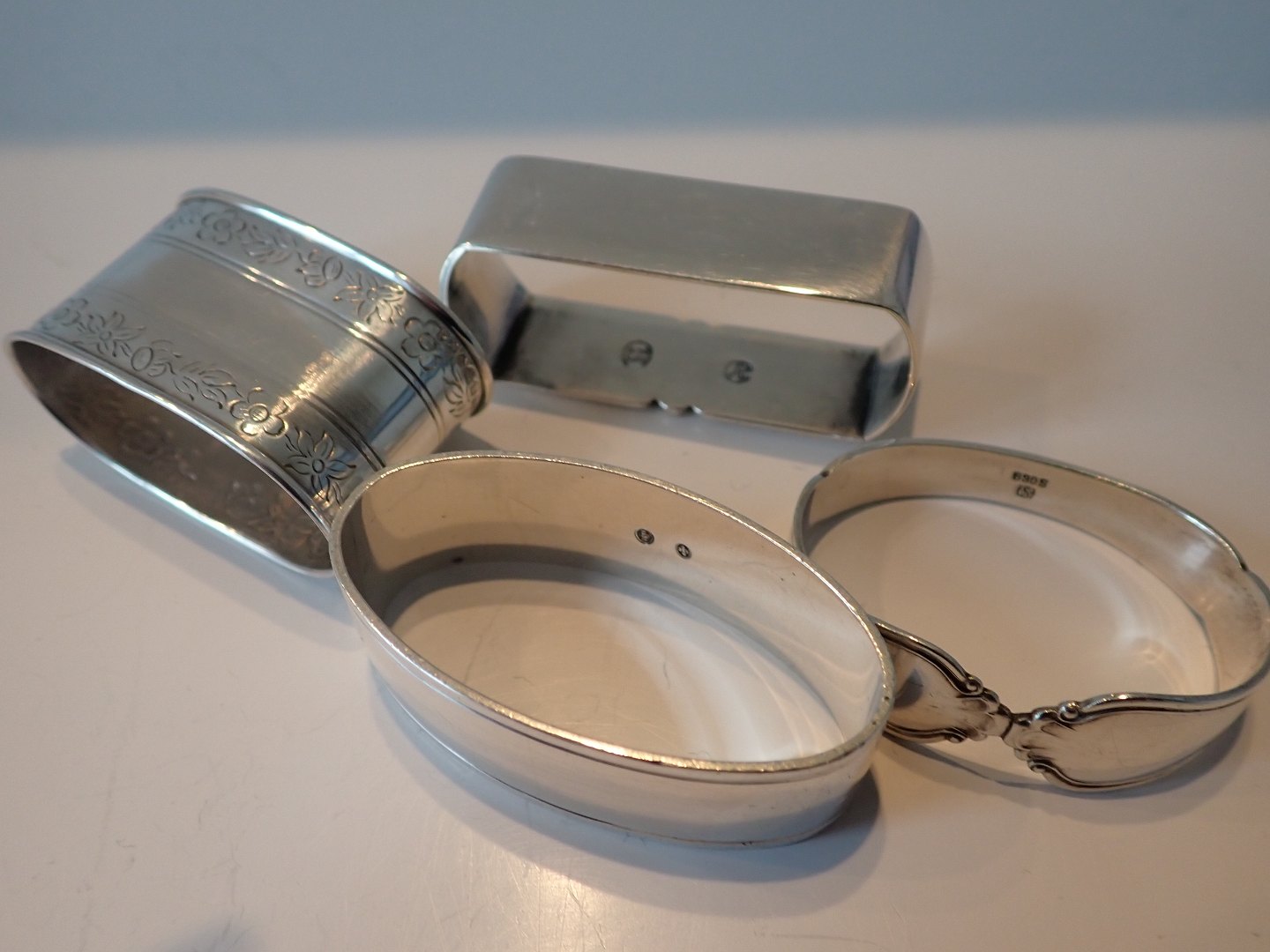 4 ovale servietringe i dansk og svensk sølv , Vægt: 12 - 30 gram. Bredeste diameter: 4,4 - 5,4 cm. Bredde: 1,5 - 2,2 cm. I pæn stand. Pris. 325 - 400 kr. pr. stk.