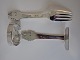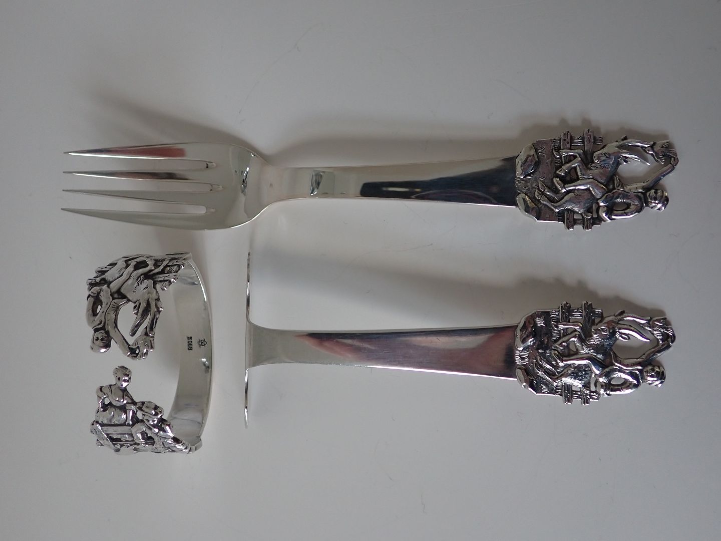 Horsens Sølvvarefabrik. Børnebestik fra "Eventyrserien" - gaffel, "skubopper" og servietring i tretårnet sølv. Motiv: "Klodshans." 1941. 1948 og 1950 Vægt: 30,8 gram, 26,4 gram og 28,7 gram. Længde: 15 cm., 10,6 cm og 4,9 x 2,4 cm. I fin stand uden indgravering.De tre "Klodshansting" samlet: 1600 kr. for de 3 dele. Gaffel: solgt. Skubopper: 550 kr. og servietring: Solgt.