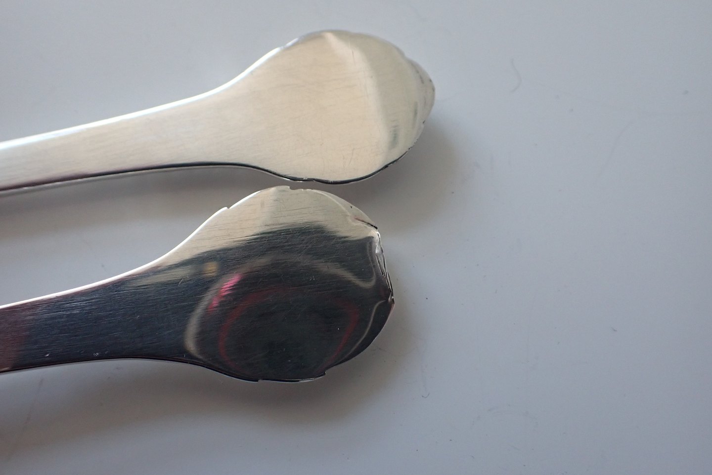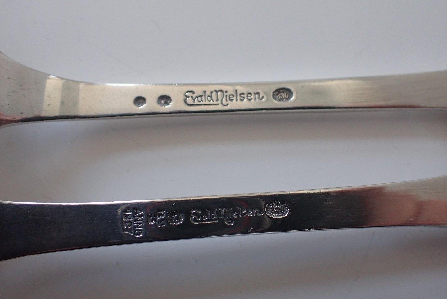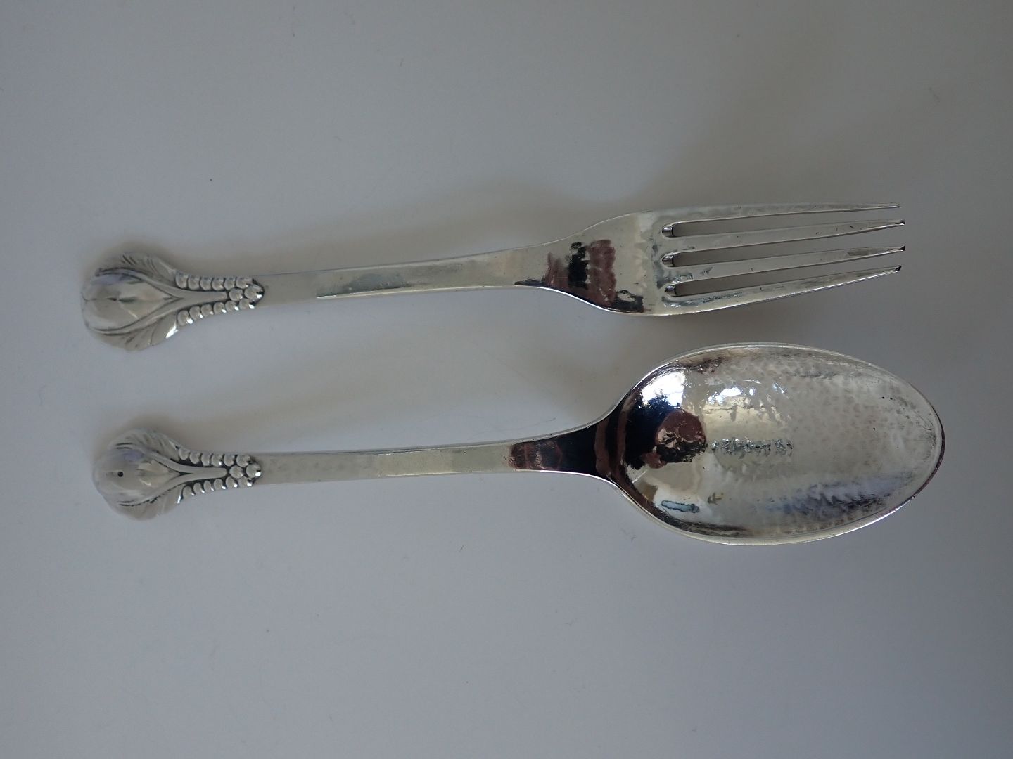Evald Nielsen (1905 - 1970) - hammerslået barneske og barnegaffel i 830 sølv, bestik no. 3. 1927. Længde: 17,5 cm. Samlet vægt: 78,2 gram. Tidstypisk slid. Sælges kun samlet.