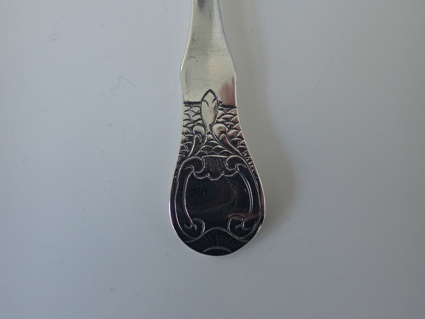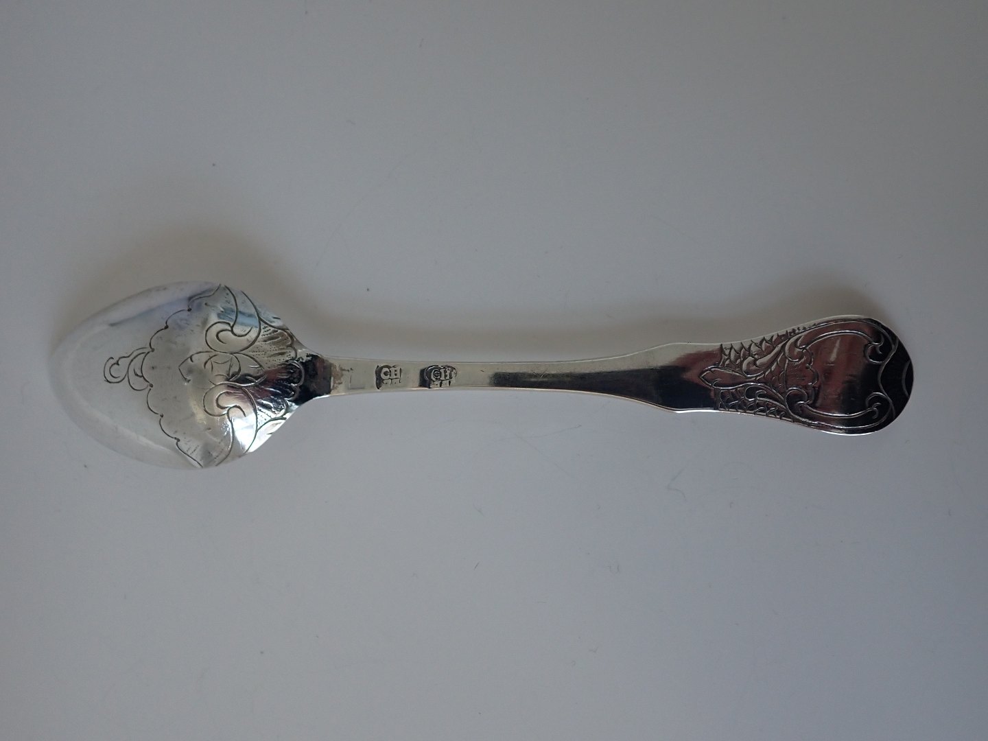 Sølvbarneske med bagsidedekoration og violinskaft stemplet CH77 - Christian N. Hosøe, København (1739 - 1812). 1777. Længde: 7,5 cm - vægt: 34 gram